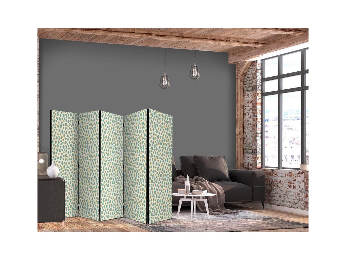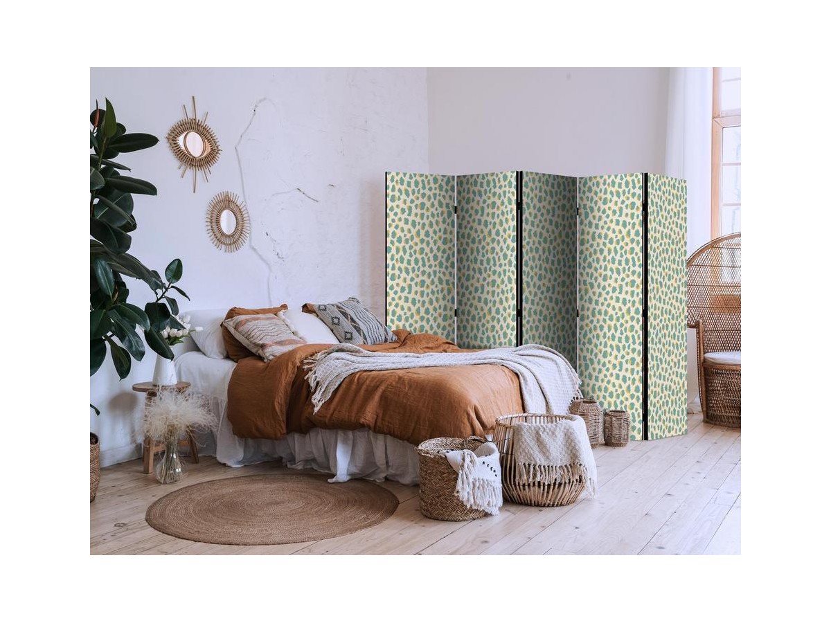 Les paravents décoratifs sont certainement une idée originale dans le domaine de la décoration intérieure. Les paravents remplissent un rôle décoratif, mais aussi bien pratique et fonctionnel. En effet, un paravent intérieur "Paravent - Giraffe Pattern - Animal Pattern in Turquoise Spots on a Light Background" est un meuble formant une cloison amovible et repliable qui peut servir pour délimiter un espace et diviser une grande pièce en deux espaces séparés. Le paravent intérieur est une invention qui est apparue pour la première fois en Chine. Depuis le début de leur existence, les paravents remplissaient des différentes fonctions, comme protéger contre les courants d'air ou bien encore créer un espace isolé pour l'intimité. De nos jours, le paravent intérieur est une belle décoration intérieure, qui permet aussi de gérer l'espace d’une ou de plusieurs pièces selon notre volonté. Le paravent intérieur est également utilisé dans les locaux de service, comme un coiffeur, un cabinet médical ou un bureau comptable pour créer un espace propice à l’intimité ou bien encore à la concentration.