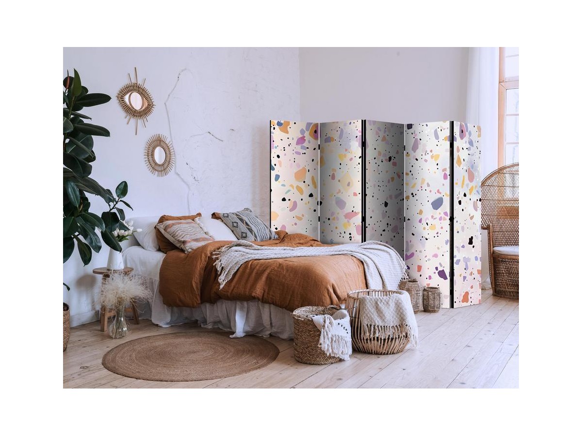 Un paravent décoratif "Paravent - Terrazzo in Confetti Style - Violet-Pink - Colorful Pattern" est composé de panneaux orientables, appelés volets, en bois encadrés d'un châssis de bois et réunis par des charnières. Le paravent décoratif disponible dans notre offre se compose de trois ou de cinq parties. Tous les paravents que nous proposons ont une impression de haute qualité sur l’entoilage qui peut être une belle décoration d'intérieur. L'entoilage d’un paravent déco est tendu sur un cadre en bois solide et léger en même temps. Les panneaux sont finis avec un ruban de satin. Les charnières métalliques sont durables et très solides.Caractéristique technique