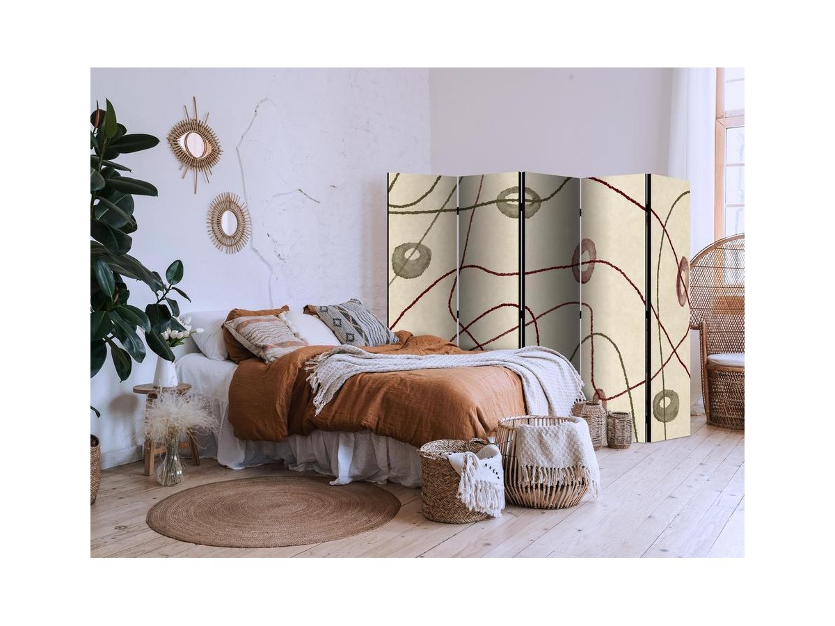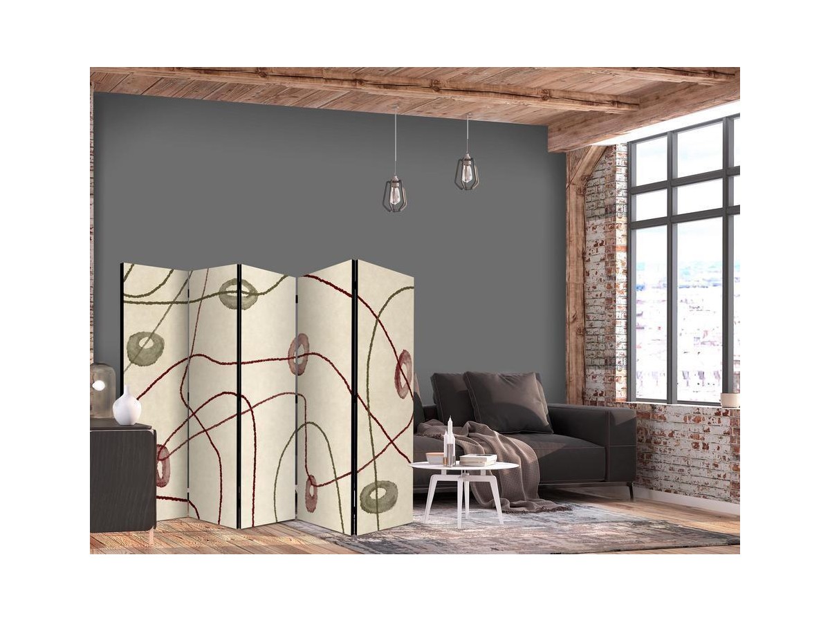 Un paravent décoratif "Paravent - Labyrinth with Beads - Minimalist Abstraction on a Worn Background" est composé de panneaux orientables, appelés volets, en bois encadrés d'un châssis de bois et réunis par des charnières. Le paravent décoratif disponible dans notre offre se compose de trois ou de cinq parties. Tous les paravents que nous proposons ont une impression de haute qualité sur l’entoilage qui peut être une belle décoration d'intérieur. L'entoilage d’un paravent déco est tendu sur un cadre en bois solide et léger en même temps. Les panneaux sont finis avec un ruban de satin. Les charnières métalliques sont durables et très solides.Caractéristique technique