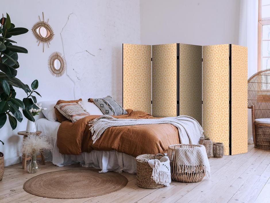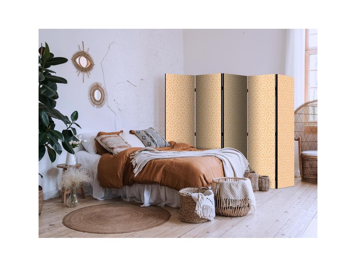 Un paravent décoratif "Paravent - Tiny Dots - Optimistic Pattern in Peach Colors" est composé de panneaux orientables, appelés volets, en bois encadrés d'un châssis de bois et réunis par des charnières. Le paravent décoratif disponible dans notre offre se compose de trois ou de cinq parties. Tous les paravents que nous proposons ont une impression de haute qualité sur l’entoilage qui peut être une belle décoration d'intérieur. L'entoilage d’un paravent déco est tendu sur un cadre en bois solide et léger en même temps. Les panneaux sont finis avec un ruban de satin. Les charnières métalliques sont durables et très solides.Caractéristique technique
