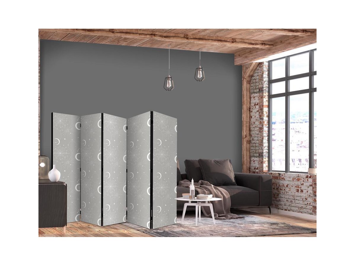 Un paravent décoratif "Paravent - Cosmic Fireworks - Elegant Pattern with Moons and Stars on a Gray Background" est composé de panneaux orientables, appelés volets, en bois encadrés d'un châssis de bois et réunis par des charnières. Le paravent décoratif disponible dans notre offre se compose de trois ou de cinq parties. Tous les paravents que nous proposons ont une impression de haute qualité sur l’entoilage qui peut être une belle décoration d'intérieur. L'entoilage d’un paravent déco est tendu sur un cadre en bois solide et léger en même temps. Les panneaux sont finis avec un ruban de satin. Les charnières métalliques sont durables et très solides.Caractéristique technique