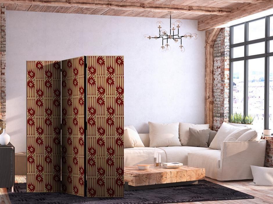 Un paravent décoratif "Paravent - Predatory Features - Red Abstract Shapes Inspired by Tribal" est composé de panneaux orientables, appelés volets, en bois encadrés d'un châssis de bois et réunis par des charnières. Le paravent décoratif disponible dans notre offre se compose de trois ou de cinq parties. Tous les paravents que nous proposons ont une impression de haute qualité sur l’entoilage qui peut être une belle décoration d'intérieur. L'entoilage d’un paravent déco est tendu sur un cadre en bois solide et léger en même temps. Les panneaux sont finis avec un ruban de satin. Les charnières métalliques sont durables et très solides.Caractéristique technique