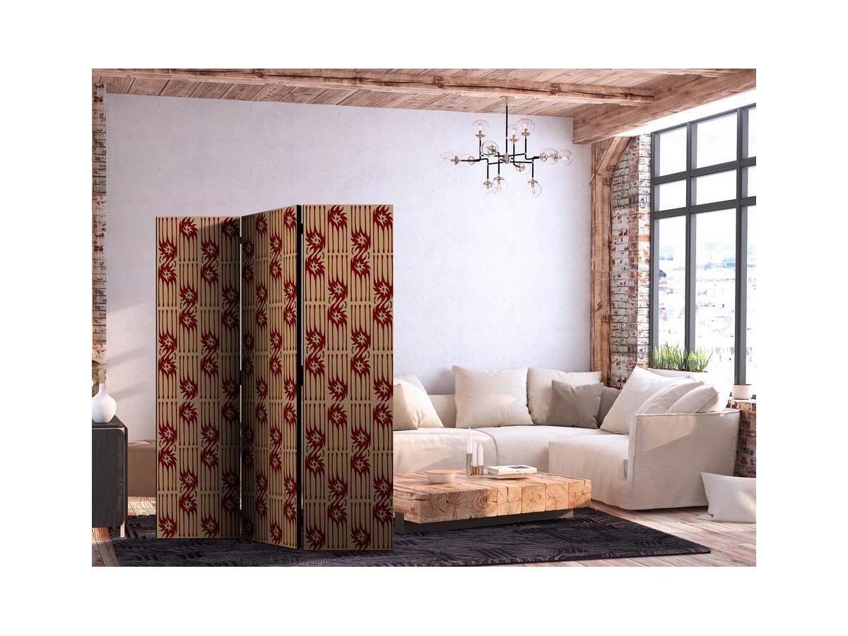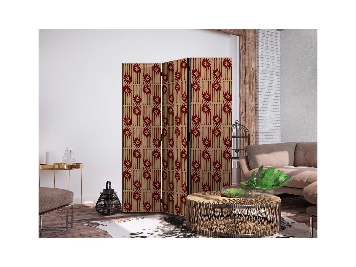 Les paravents décoratifs sont certainement une idée originale dans le domaine de la décoration intérieure. Les paravents remplissent un rôle décoratif, mais aussi bien pratique et fonctionnel. En effet, un paravent intérieur "Paravent - Predatory Features - Red Abstract Shapes Inspired by Tribal" est un meuble formant une cloison amovible et repliable qui peut servir pour délimiter un espace et diviser une grande pièce en deux espaces séparés. Le paravent intérieur est une invention qui est apparue pour la première fois en Chine. Depuis le début de leur existence, les paravents remplissaient des différentes fonctions, comme protéger contre les courants d'air ou bien encore créer un espace isolé pour l'intimité. De nos jours, le paravent intérieur est une belle décoration intérieure, qui permet aussi de gérer l'espace d’une ou de plusieurs pièces selon notre volonté. Le paravent intérieur est également utilisé dans les locaux de service, comme un coiffeur, un cabinet médical ou un bureau comptable pour créer un espace propice à l’intimité ou bien encore à la concentration.