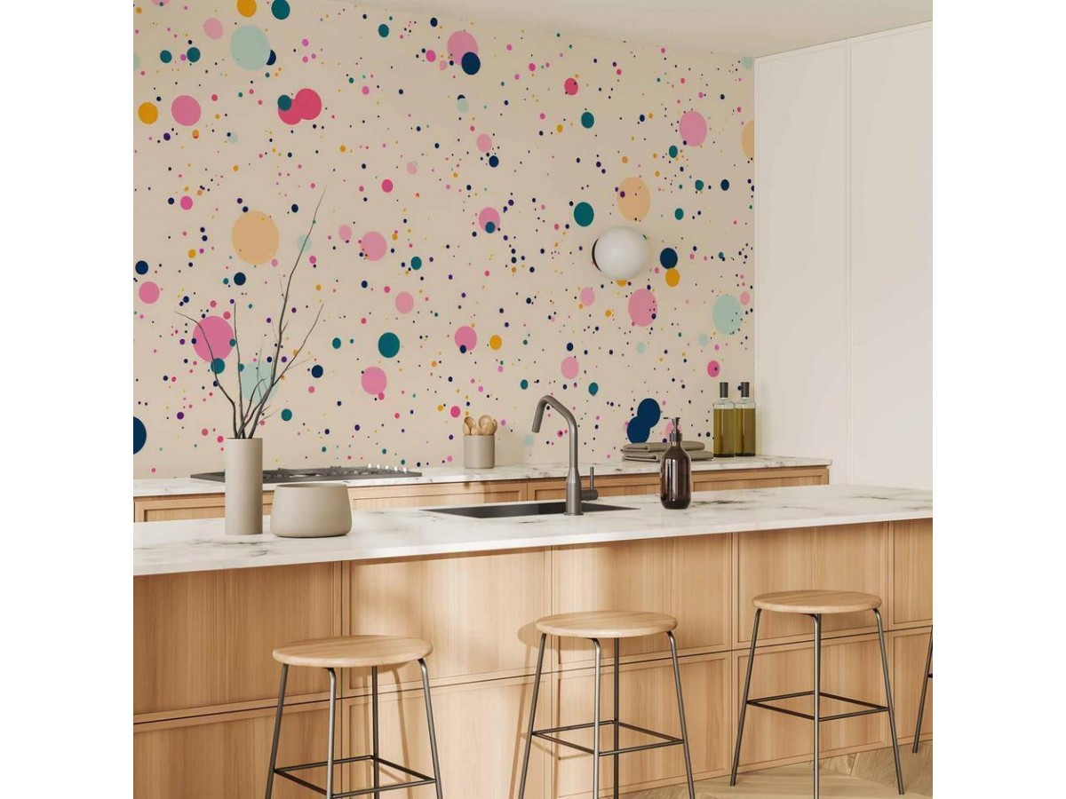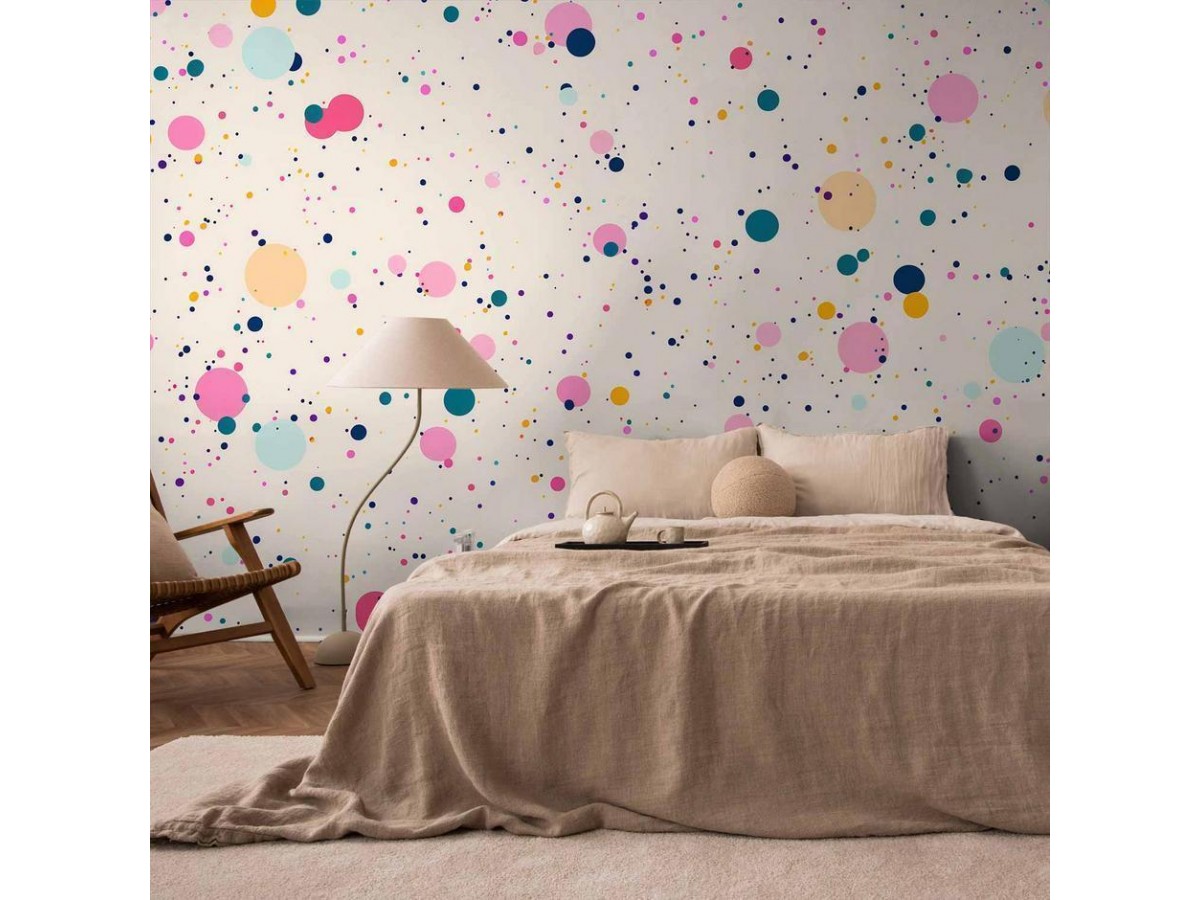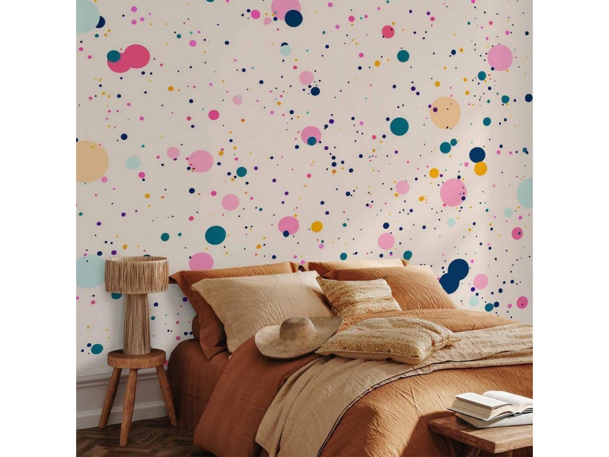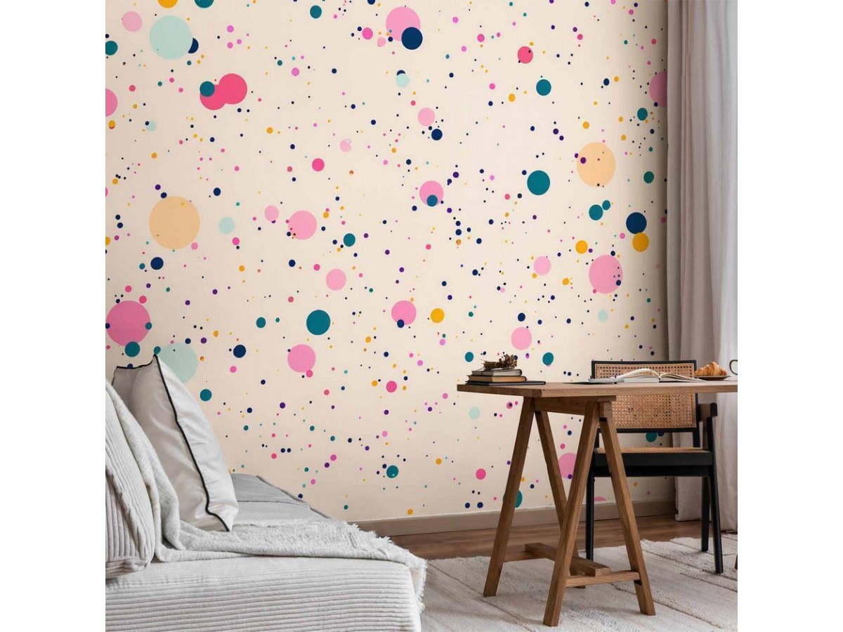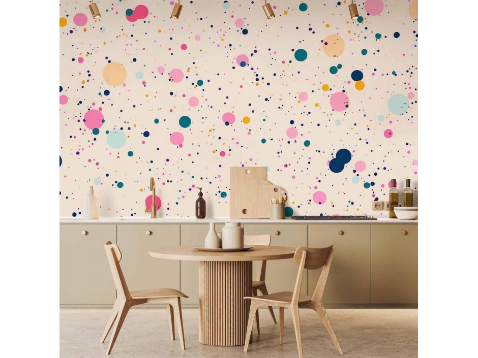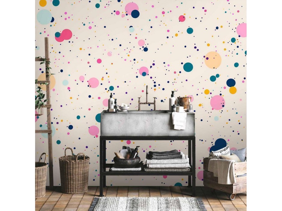 Papier peintUn "Papier peint - Dots Speckles and Splatters Multicolored Cheerful Pattern on a Light Pink Background" disponible dans notre offre est une solution simple et rapide pour des personnes qui veulent redonner une nouvelle vie...