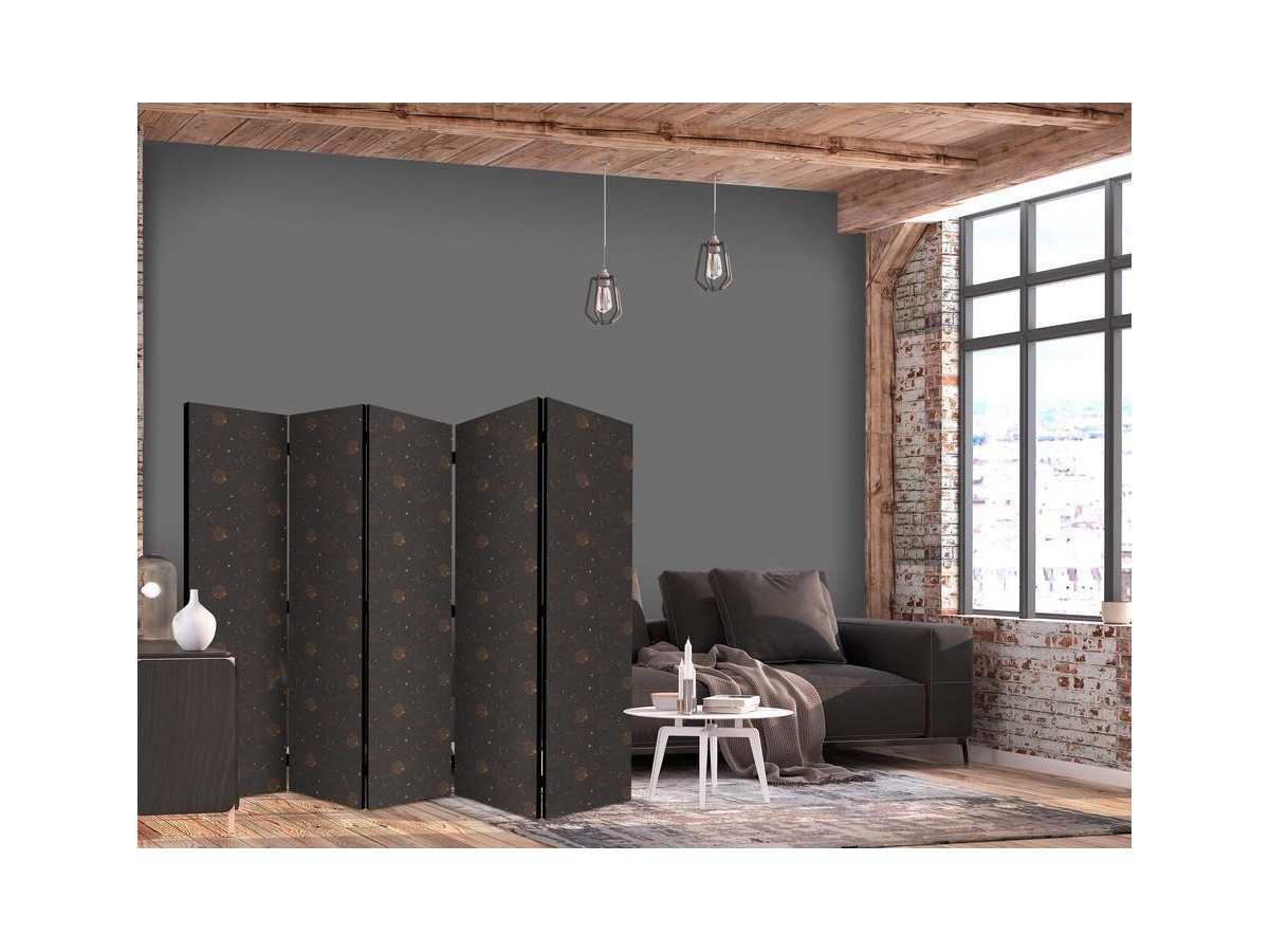 Les paravents décoratifs sont certainement une idée originale dans le domaine de la décoration intérieure. Les paravents remplissent un rôle décoratif, mais aussi bien pratique et fonctionnel. En effet, un paravent intérieur "Paravent - Night Sky - Artistic Composition of Suns and Planets on a Black Background" est un meuble formant une cloison amovible et repliable qui peut servir pour délimiter un espace et diviser une grande pièce en deux espaces séparés. Le paravent intérieur est une invention qui est apparue pour la première fois en Chine. Depuis le début de leur existence, les paravents remplissaient des différentes fonctions, comme protéger contre les courants d'air ou bien encore créer un espace isolé pour l'intimité. De nos jours, le paravent intérieur est une belle décoration intérieure, qui permet aussi de gérer l'espace d’une ou de plusieurs pièces selon notre volonté. Le paravent intérieur est également utilisé dans les locaux de service, comme un coiffeur, un cabinet médical ou un bureau comptable pour créer un espace propice à l’intimité ou bien encore à la concentration.