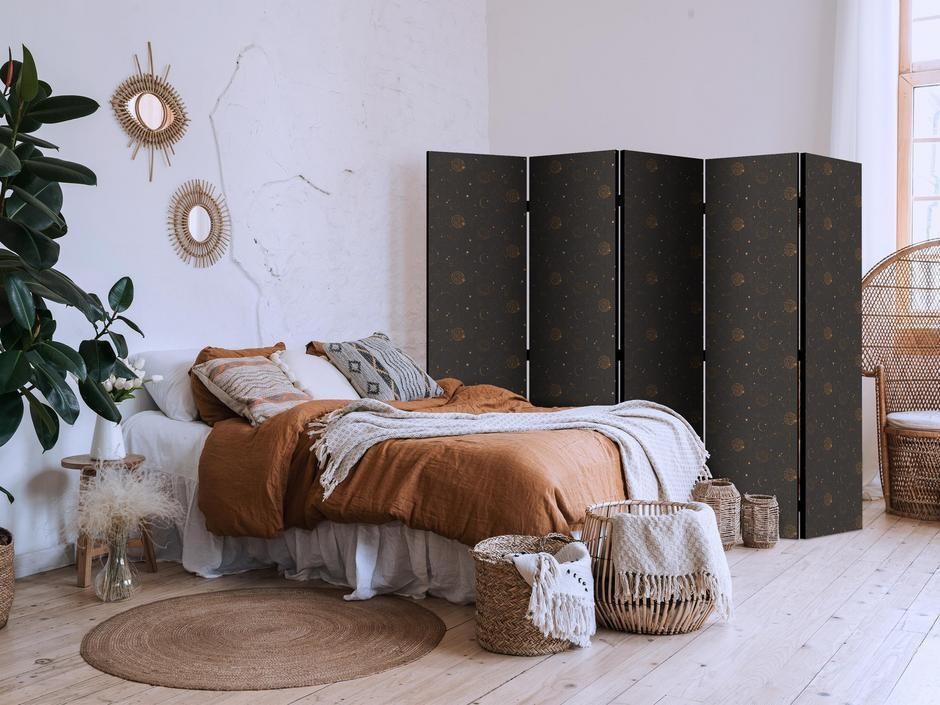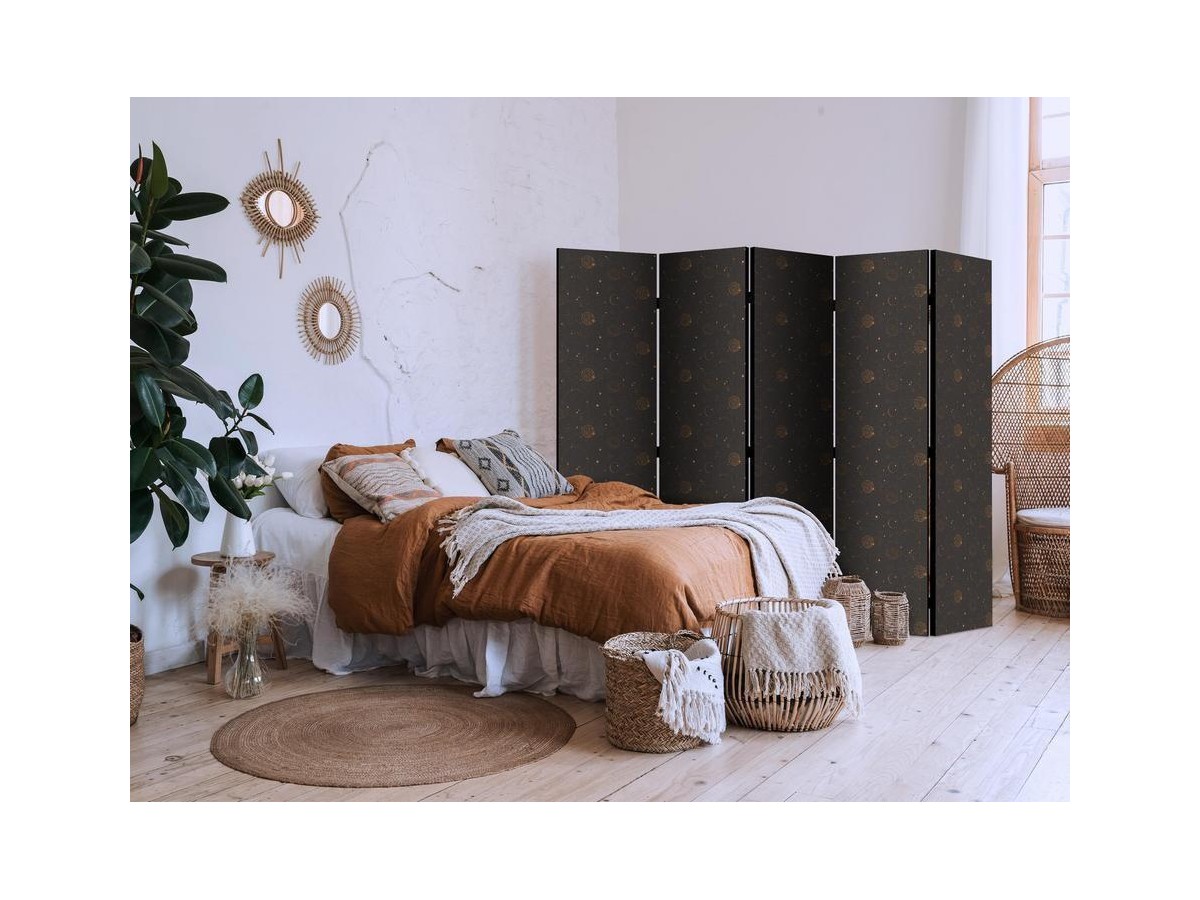 Un paravent décoratif "Paravent - Night Sky - Artistic Composition of Suns and Planets on a Black Background" est composé de panneaux orientables, appelés volets, en bois encadrés d'un châssis de bois et réunis par des charnières. Le paravent décoratif disponible dans notre offre se compose de trois ou de cinq parties. Tous les paravents que nous proposons ont une impression de haute qualité sur l’entoilage qui peut être une belle décoration d'intérieur. L'entoilage d’un paravent déco est tendu sur un cadre en bois solide et léger en même temps. Les panneaux sont finis avec un ruban de satin. Les charnières métalliques sont durables et très solides.Caractéristique technique