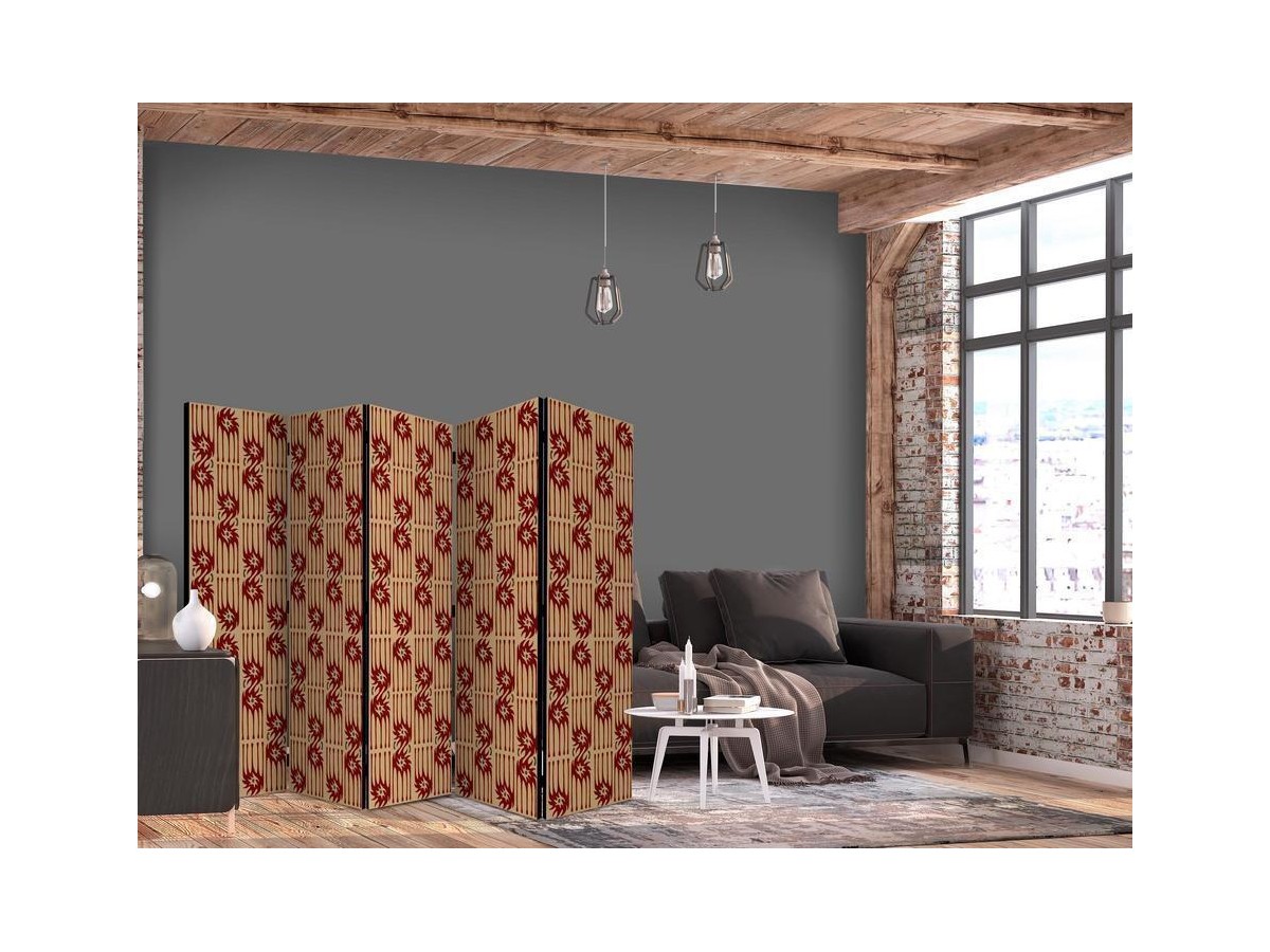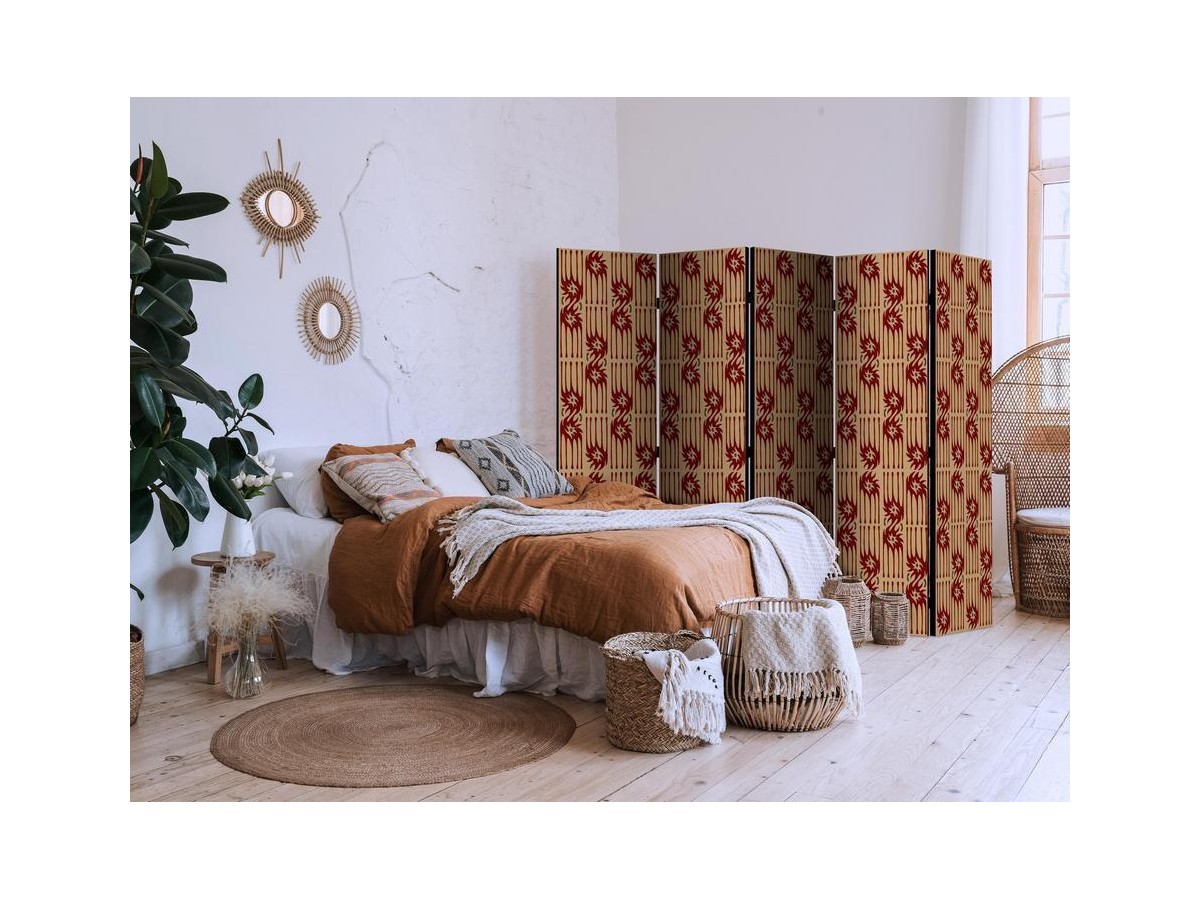 Un paravent décoratif "Paravent - Predatory Features - Red Abstract Shapes Inspired by Tribal" est composé de panneaux orientables, appelés volets, en bois encadrés d'un châssis de bois et réunis par des charnières. Le paravent décoratif disponible dans notre offre se compose de trois ou de cinq parties. Tous les paravents que nous proposons ont une impression de haute qualité sur l’entoilage qui peut être une belle décoration d'intérieur. L'entoilage d’un paravent déco est tendu sur un cadre en bois solide et léger en même temps. Les panneaux sont finis avec un ruban de satin. Les charnières métalliques sont durables et très solides.Caractéristique technique