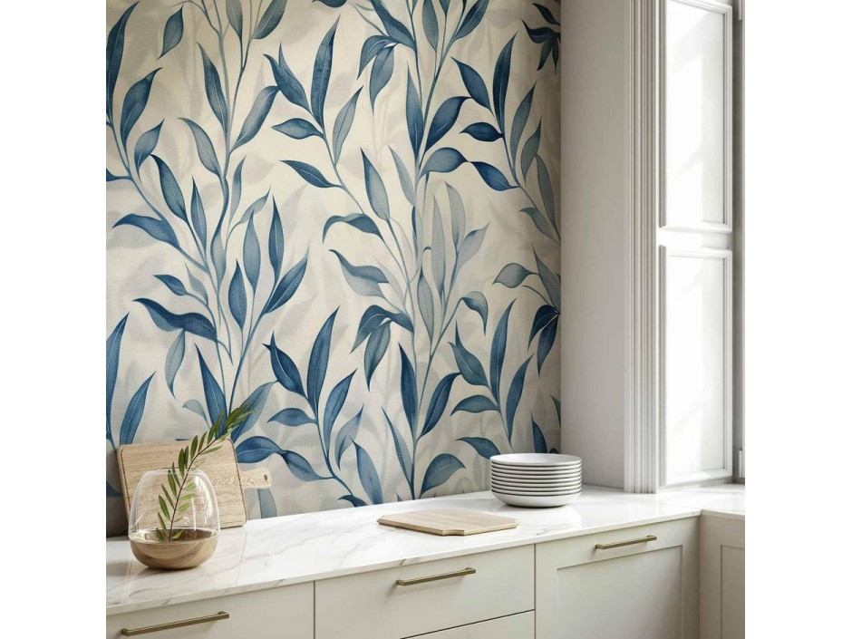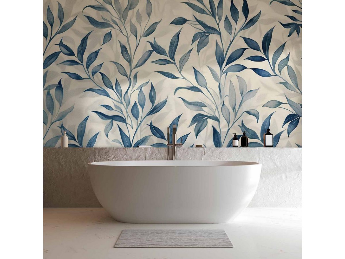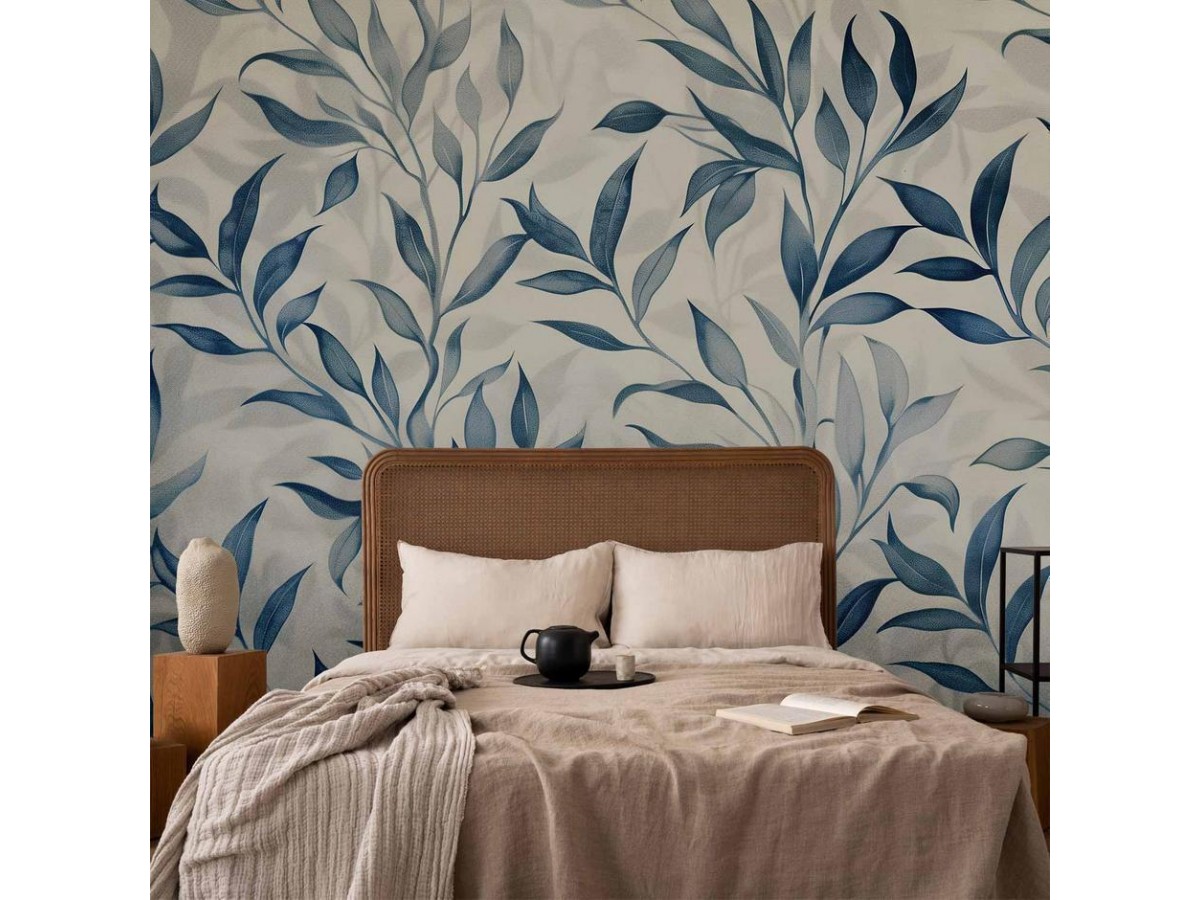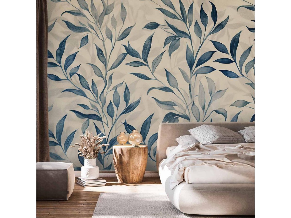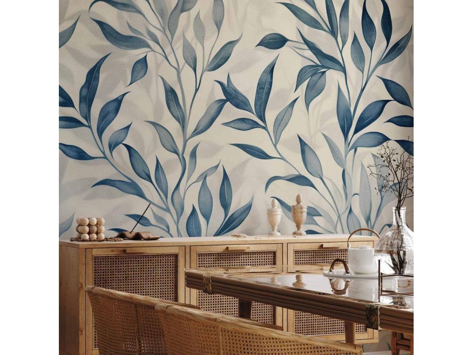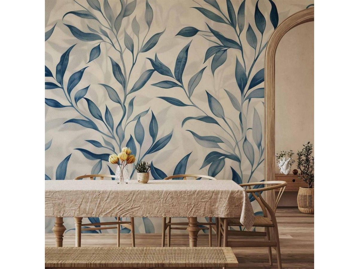 Papier peint - Leaves in Blue Colors Delicate Botanical Motif