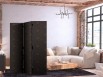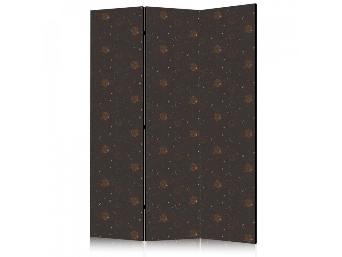 Les paravents décoratifs sont certainement une idée originale dans le domaine de la décoration intérieure. Les paravents remplissent un rôle décoratif, mais aussi bien pratique et fonctionnel. En effet, un paravent intérieur "Paravent - Night Sky - Artistic Composition of Suns and Planets on a Black Background" est un meuble formant une cloison amovible et repliable qui peut servir pour délimiter un espace et diviser une grande pièce en deux espaces séparés. Le paravent intérieur est une invention qui est apparue pour la première fois en Chine. Depuis le début de leur existence, les paravents remplissaient des différentes fonctions, comme protéger contre les courants d'air ou bien encore créer un espace isolé pour l'intimité. De nos jours, le paravent intérieur est une belle décoration intérieure, qui permet aussi de gérer l'espace d’une ou de plusieurs pièces selon notre volonté. Le paravent intérieur est également utilisé dans les locaux de service, comme un coiffeur, un cabinet médical ou un bureau comptable pour créer un espace propice à l’intimité ou bien encore à la concentration.
