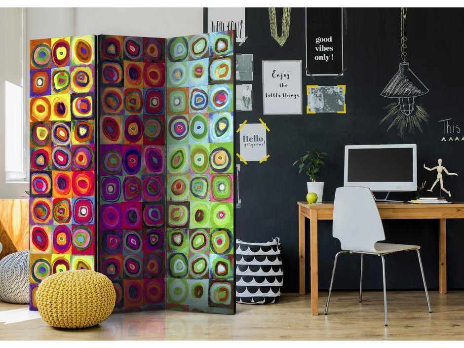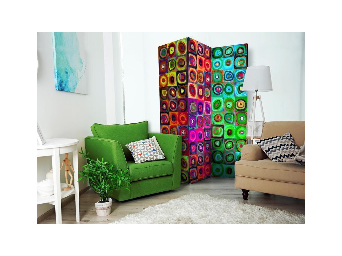 Les paravents décoratifs sont certainement une idée originale dans le domaine de la décoration intérieure. Les paravents remplissent un rôle décoratif, mais aussi bien pratique et fonctionnel. En effet, un paravent intérieur "Paravent - Colorful Abstract Art" est un meuble formant une cloison amovible et repliable qui peut servir pour délimiter un espace et diviser une grande pièce en deux espaces séparés. Le paravent intérieur est une invention qui est apparue pour la première fois en Chine. Depuis le début de leur existence, les paravents remplissaient des différentes fonctions, comme protéger contre les courants d'air ou bien encore créer un espace isolé pour l'intimité. De nos jours, le paravent intérieur est une belle décoration intérieure, qui permet aussi de gérer l'espace d’une ou de plusieurs pièces selon notre volonté. Le paravent intérieur est également utilisé dans les locaux de service, comme un coiffeur, un cabinet médical ou un bureau comptable pour créer un espace propice à l’intimité ou bien encore à la concentration.