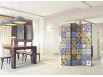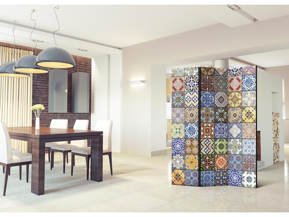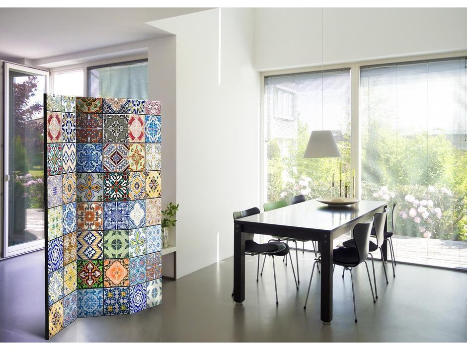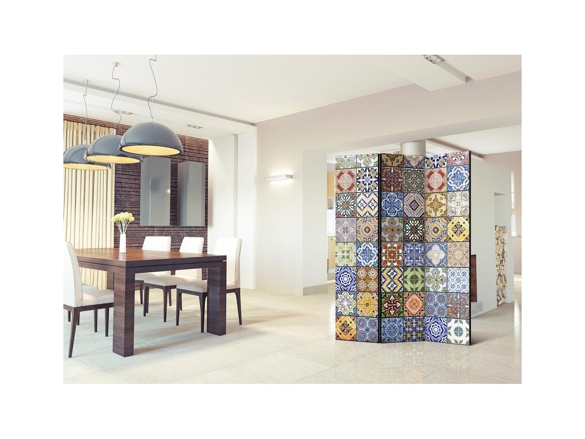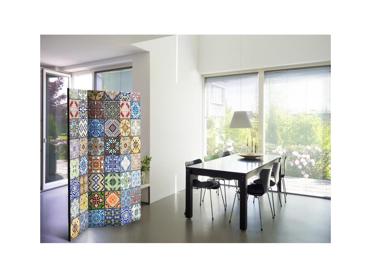 Les paravents décoratifs sont certainement une idée originale dans le domaine de la décoration intérieure. Les paravents remplissent un rôle décoratif, mais aussi bien pratique et fonctionnel. En effet, un paravent intérieur "Paravent - Colorful Mosaic" est un meuble formant une cloison amovible et repliable qui peut servir pour délimiter un espace et diviser une grande pièce en deux espaces séparés. Le paravent intérieur est une invention qui est apparue pour la première fois en Chine. Depuis le début de leur existence, les paravents remplissaient des différentes fonctions, comme protéger contre les courants d'air ou bien encore créer un espace isolé pour l'intimité. De nos jours, le paravent intérieur est une belle décoration intérieure, qui permet aussi de gérer l'espace d’une ou de plusieurs pièces selon notre volonté. Le paravent intérieur est également utilisé dans les locaux de service, comme un coiffeur, un cabinet médical ou un bureau comptable pour créer un espace propice à l’intimité ou bien encore à la concentration.