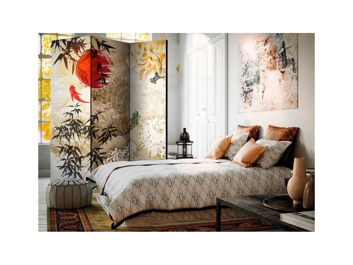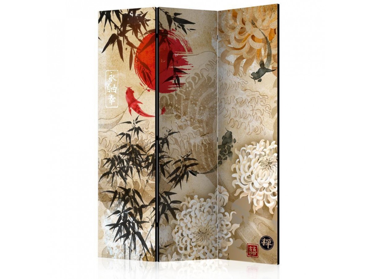 Les paravents décoratifs sont certainement une idée originale dans le domaine de la décoration intérieure. Les paravents remplissent un rôle décoratif, mais aussi bien pratique et fonctionnel. En effet, un paravent intérieur "Paravent - Fish Dance" est un meuble formant une cloison amovible et repliable qui peut servir pour délimiter un espace et diviser une grande pièce en deux espaces séparés. Le paravent intérieur est une invention qui est apparue pour la première fois en Chine. Depuis le début de leur existence, les paravents remplissaient des différentes fonctions, comme protéger contre les courants d'air ou bien encore créer un espace isolé pour l'intimité. De nos jours, le paravent intérieur est une belle décoration intérieure, qui permet aussi de gérer l'espace d’une ou de plusieurs pièces selon notre volonté. Le paravent intérieur est également utilisé dans les locaux de service, comme un coiffeur, un cabinet médical ou un bureau comptable pour créer un espace propice à l’intimité ou bien encore à la concentration.
