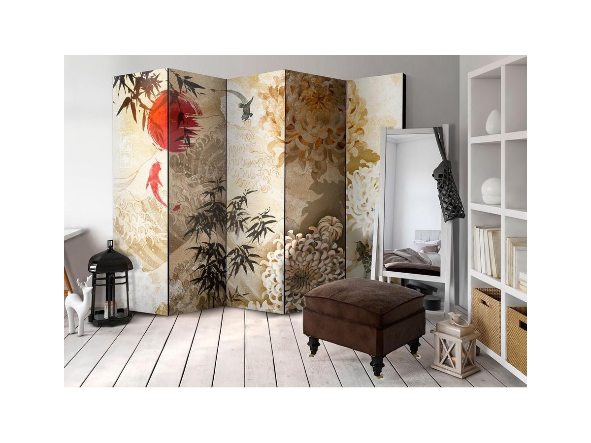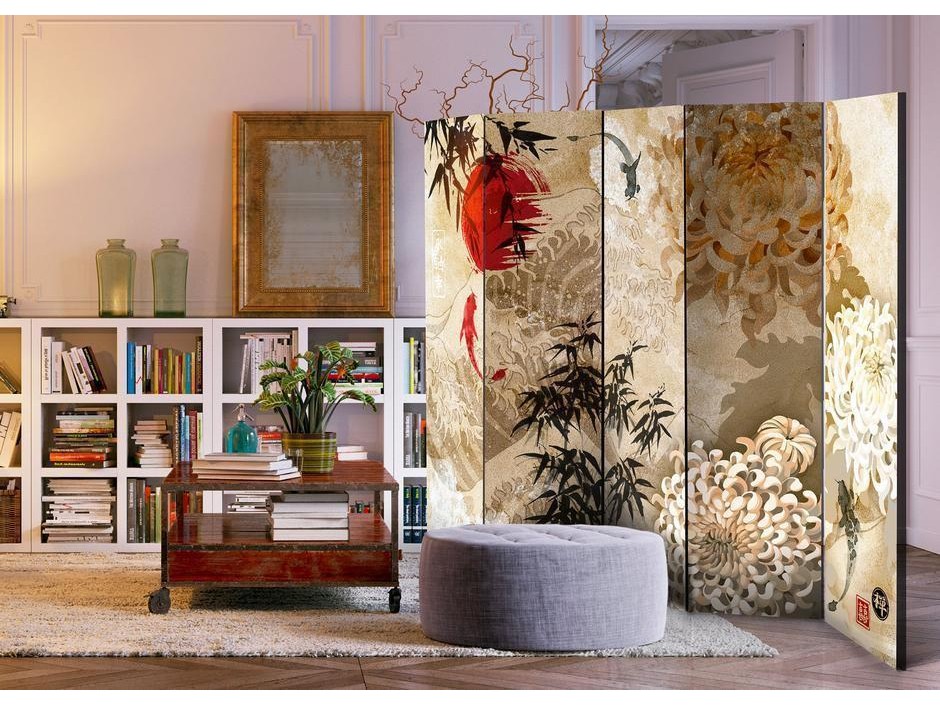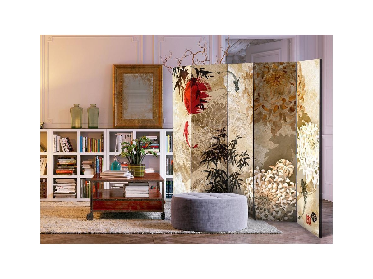 Les paravents décoratifs sont certainement une idée originale dans le domaine de la décoration intérieure. Les paravents remplissent un rôle décoratif, mais aussi bien pratique et fonctionnel. En effet, un paravent intérieur "Paravent - Fish Dance II" est un meuble formant une cloison amovible et repliable qui peut servir pour délimiter un espace et diviser une grande pièce en deux espaces séparés. Le paravent intérieur est une invention qui est apparue pour la première fois en Chine. Depuis le début de leur existence, les paravents remplissaient des différentes fonctions, comme protéger contre les courants d'air ou bien encore créer un espace isolé pour l'intimité. De nos jours, le paravent intérieur est une belle décoration intérieure, qui permet aussi de gérer l'espace d’une ou de plusieurs pièces selon notre volonté. Le paravent intérieur est également utilisé dans les locaux de service, comme un coiffeur, un cabinet médical ou un bureau comptable pour créer un espace propice à l’intimité ou bien encore à la concentration.