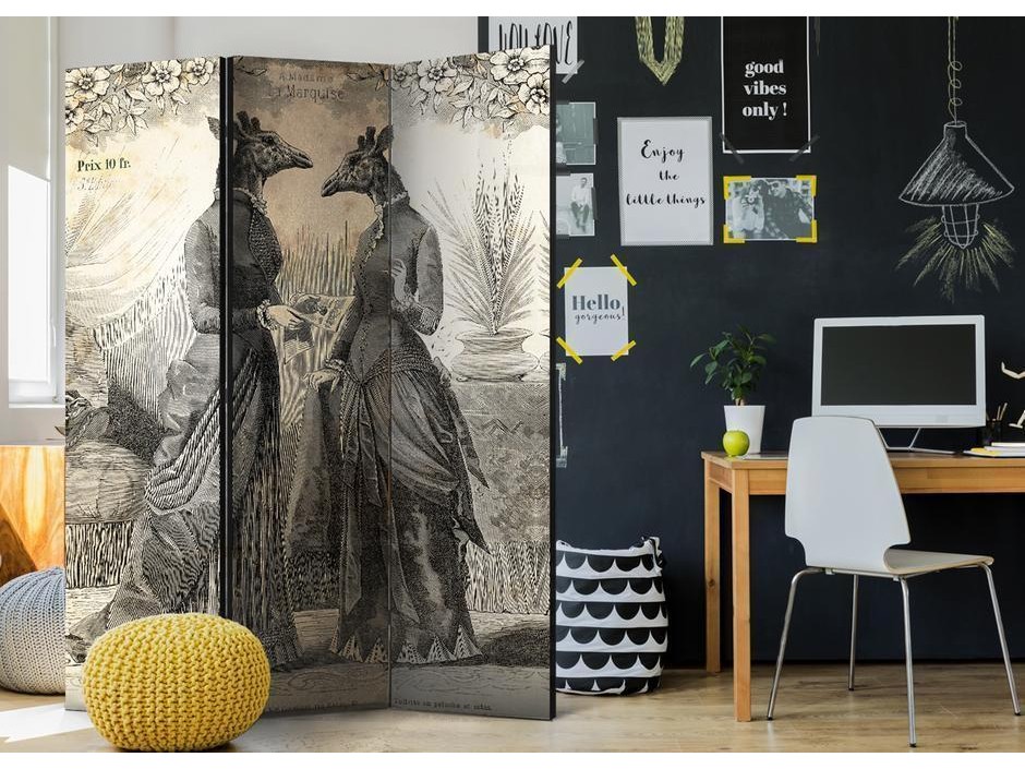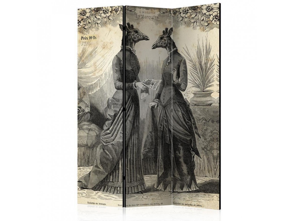 Un paravent décoratif "Paravent - Conversation" est composé de panneaux orientables, appelés volets, en bois encadrés d'un châssis de bois et réunis par des charnières. Le paravent décoratif disponible dans notre offre se compose de trois ou de cinq parties. Tous les paravents que nous proposons ont une impression de haute qualité sur l’entoilage qui peut être une belle décoration d'intérieur. L'entoilage d’un paravent déco est tendu sur un cadre en bois solide et léger en même temps. Les panneaux sont finis avec un ruban de satin. Les charnières métalliques sont durables et très solides.Caractéristique technique