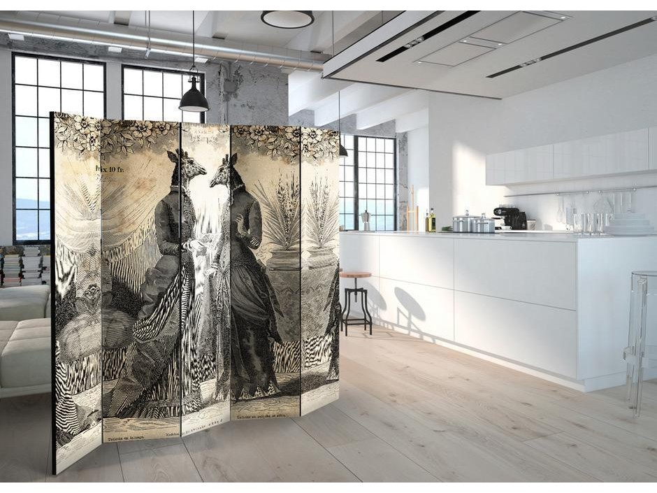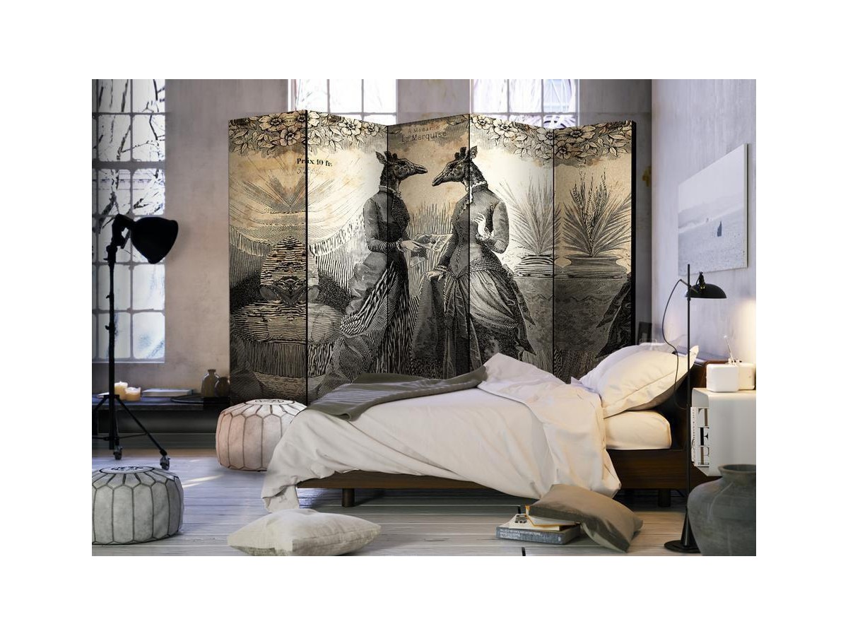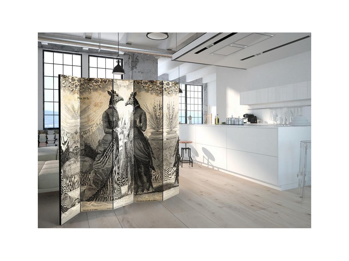 Un paravent décoratif "Paravent - Conversation II" est composé de panneaux orientables, appelés volets, en bois encadrés d'un châssis de bois et réunis par des charnières. Le paravent décoratif disponible dans notre offre se compose de trois ou de cinq parties. Tous les paravents que nous proposons ont une impression de haute qualité sur l’entoilage qui peut être une belle décoration d'intérieur. L'entoilage d’un paravent déco est tendu sur un cadre en bois solide et léger en même temps. Les panneaux sont finis avec un ruban de satin. Les charnières métalliques sont durables et très solides.Caractéristique technique