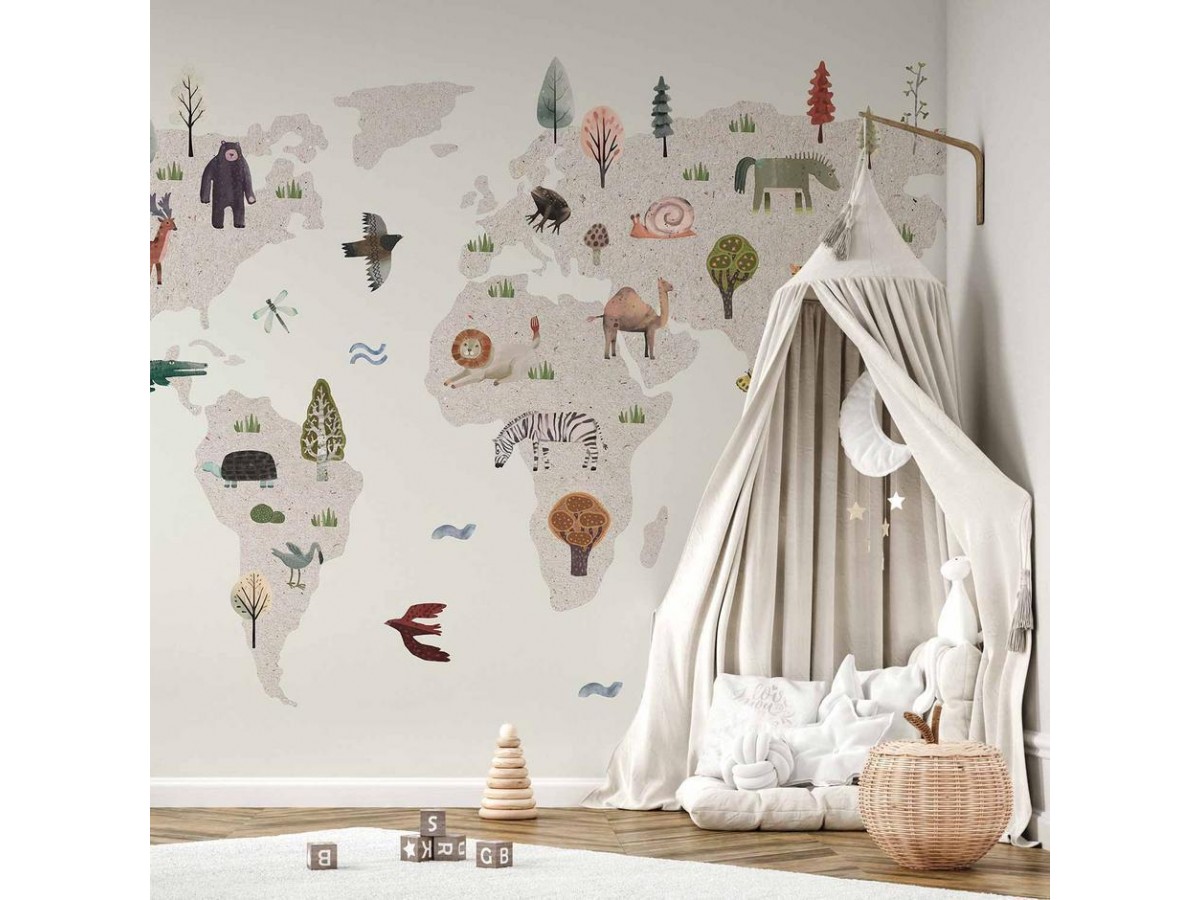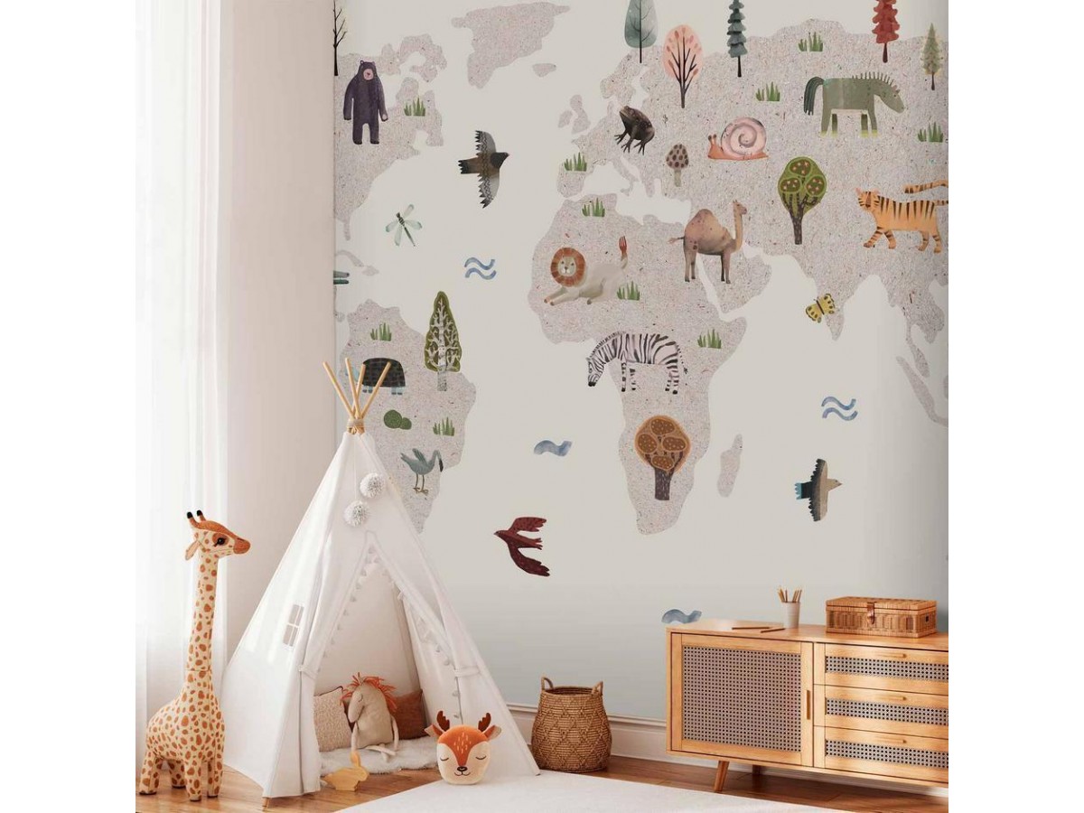 Papier peint - Beige World - Continents With Animals in Muted Colours