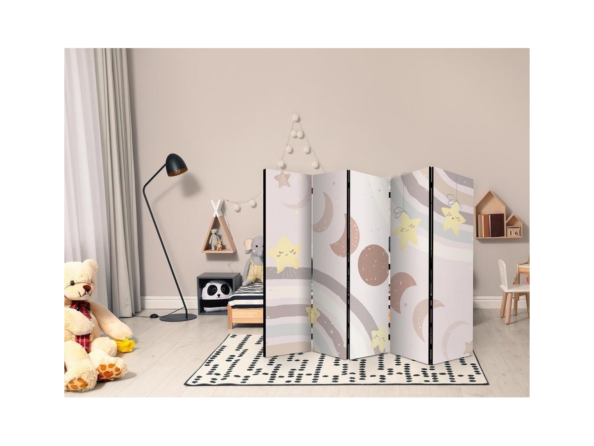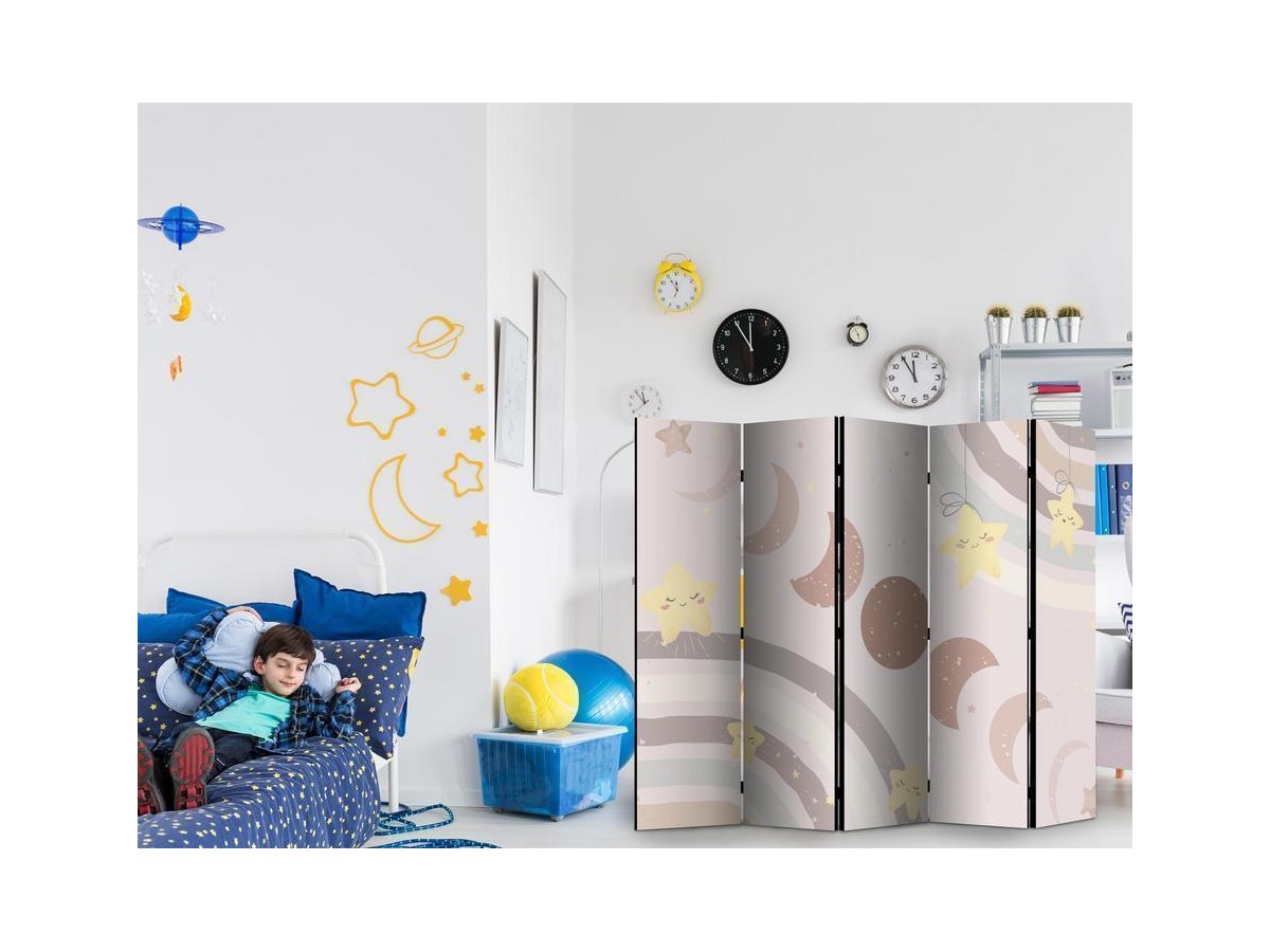 Paravent intérieur "Paravent - Joyful Sky - Yellow Cheerful Stars with a Rainbow Against the Phases of the Moon - in the Sky Colored Light Beige"