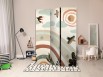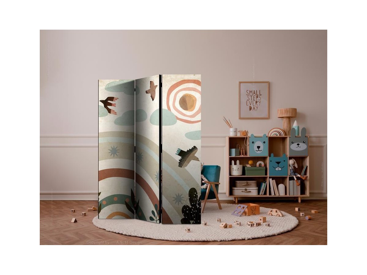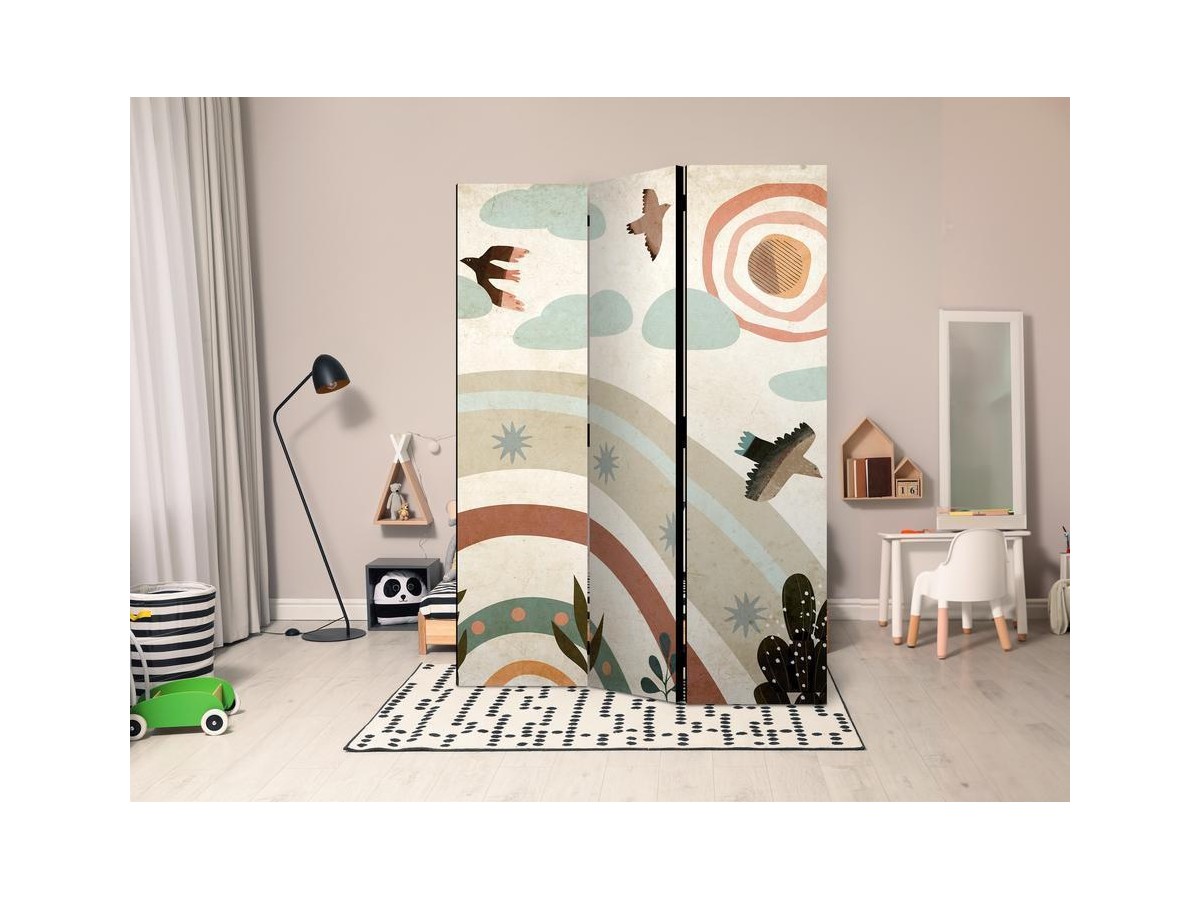 Les paravents décoratifs sont certainement une idée originale dans le domaine de la décoration intérieure. Les paravents remplissent un rôle décoratif, mais aussi bien pratique et fonctionnel. En effet, un paravent intérieur "Paravent - Sun Above the Rainbow - Birds in Subdued Colors Flying Among Clouds Above a Rainbow and Vegetation on a Light Beige Background" est un meuble formant une cloison amovible et repliable qui peut servir pour délimiter un espace et diviser une grande pièce en deux espaces séparés. Le paravent intérieur est une invention qui est apparue pour la première fois en Chine. Depuis le début de leur existence, les paravents remplissaient des différentes fonctions, comme protéger contre les courants d'air ou bien encore créer un espace isolé pour l'intimité. De nos jours, le paravent intérieur est une belle décoration intérieure, qui permet aussi de gérer l'espace d’une ou de plusieurs pièces selon notre volonté. Le paravent intérieur est également utilisé dans les locaux de service, comme un coiffeur, un cabinet médical ou un bureau comptable pour créer un espace propice à l’intimité ou bien encore à la concentration.