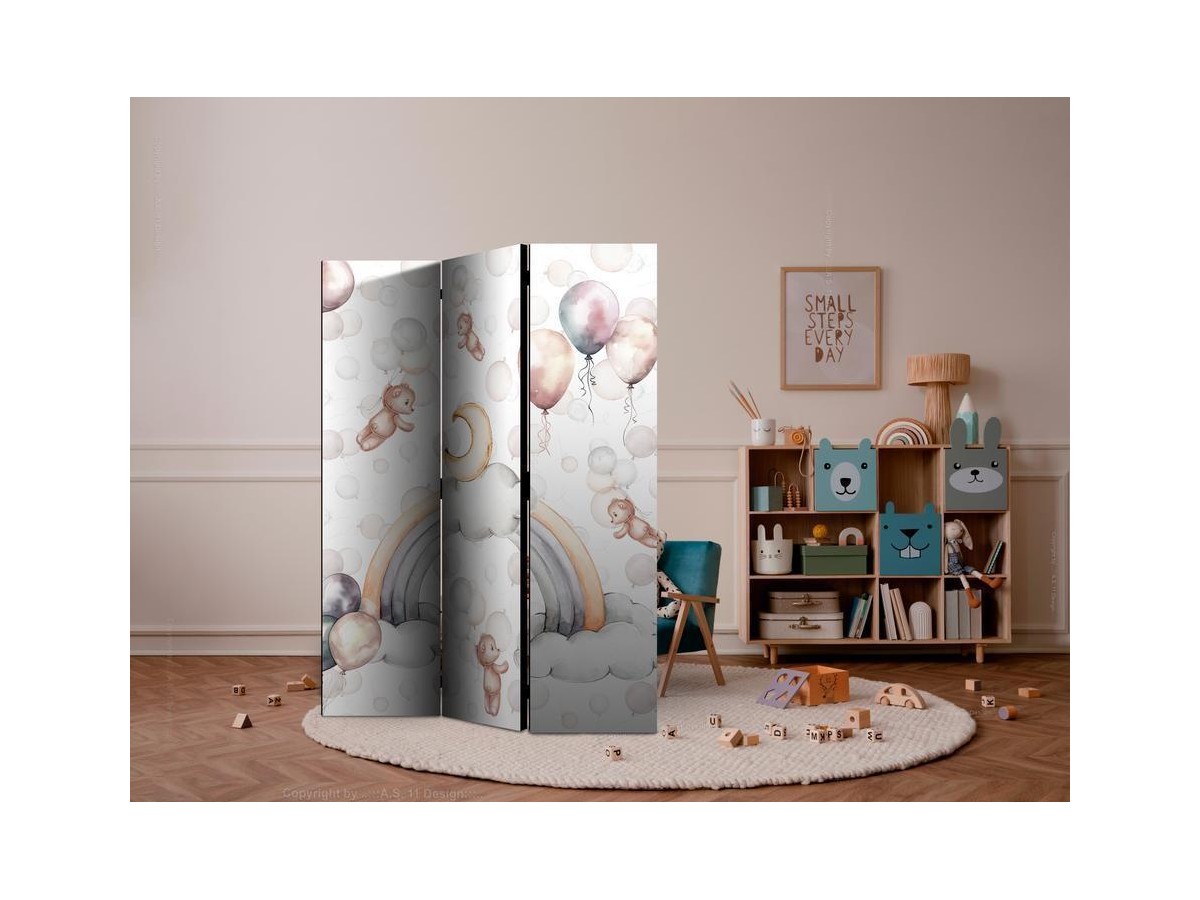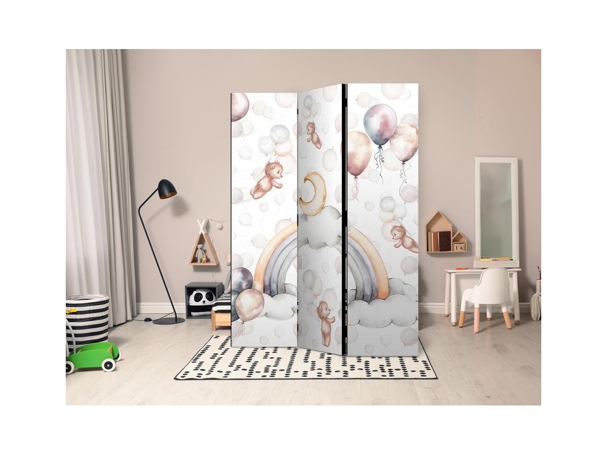 Les paravents décoratifs sont certainement une idée originale dans le domaine de la décoration intérieure. Les paravents remplissent un rôle décoratif, mais aussi bien pratique et fonctionnel. En effet, un paravent intérieur "Paravent - Plush Bears with Balloons - Flying Light-Brown Bears Among Balloons - Clouds - and Rainbows in Subdued - Pastel Hues" est un meuble formant une cloison amovible et repliable qui peut servir pour délimiter un espace et diviser une grande pièce en deux espaces séparés. Le paravent intérieur est une invention qui est apparue pour la première fois en Chine. Depuis le début de leur existence, les paravents remplissaient des différentes fonctions, comme protéger contre les courants d'air ou bien encore créer un espace isolé pour l'intimité. De nos jours, le paravent intérieur est une belle décoration intérieure, qui permet aussi de gérer l'espace d’une ou de plusieurs pièces selon notre volonté. Le paravent intérieur est également utilisé dans les locaux de service, comme un coiffeur, un cabinet médical ou un bureau comptable pour créer un espace propice à l’intimité ou bien encore à la concentration.
