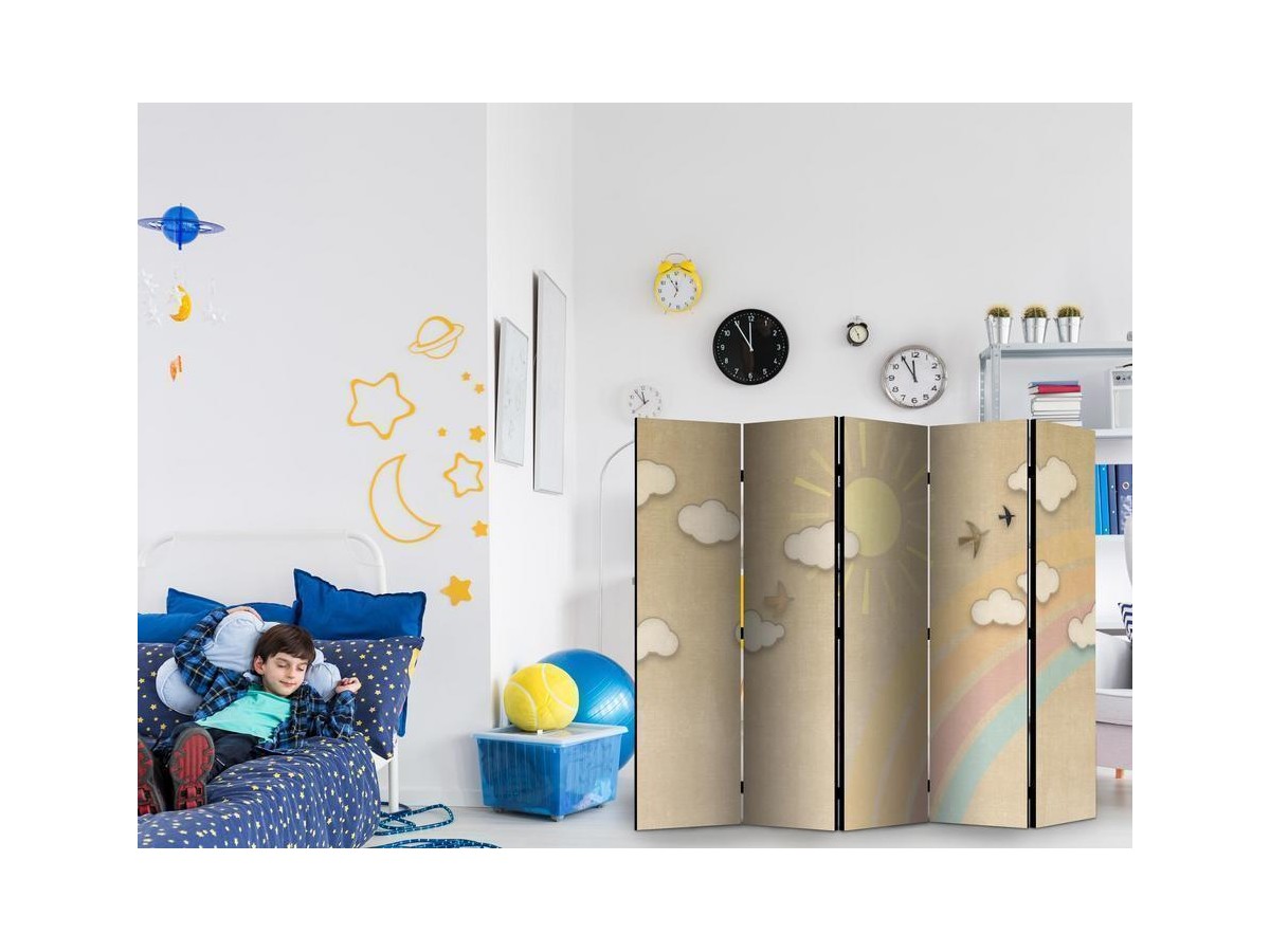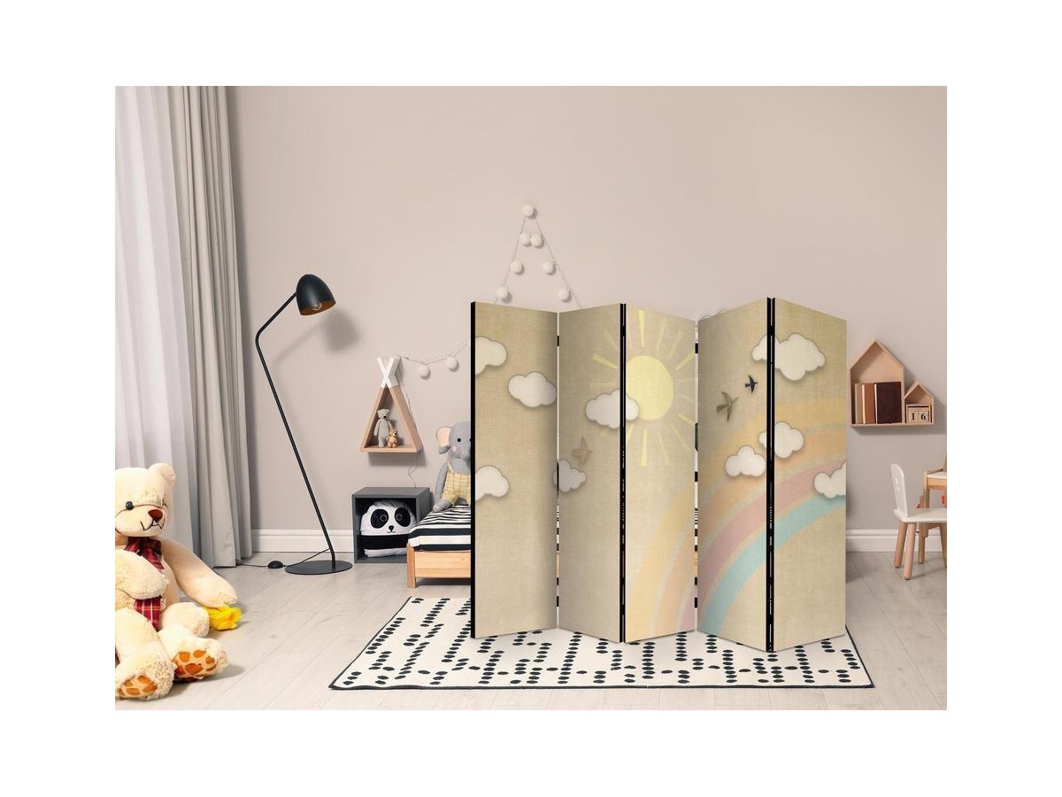 Les paravents décoratifs sont certainement une idée originale dans le domaine de la décoration intérieure. Les paravents remplissent un rôle décoratif, mais aussi bien pratique et fonctionnel. En effet, un paravent intérieur "Paravent - Holiday Sky - A Rainbow on a Sunny Day and Flying Birds" est un meuble formant une cloison amovible et repliable qui peut servir pour délimiter un espace et diviser une grande pièce en deux espaces séparés. Le paravent intérieur est une invention qui est apparue pour la première fois en Chine. Depuis le début de leur existence, les paravents remplissaient des différentes fonctions, comme protéger contre les courants d'air ou bien encore créer un espace isolé pour l'intimité. De nos jours, le paravent intérieur est une belle décoration intérieure, qui permet aussi de gérer l'espace d’une ou de plusieurs pièces selon notre volonté. Le paravent intérieur est également utilisé dans les locaux de service, comme un coiffeur, un cabinet médical ou un bureau comptable pour créer un espace propice à l’intimité ou bien encore à la concentration.