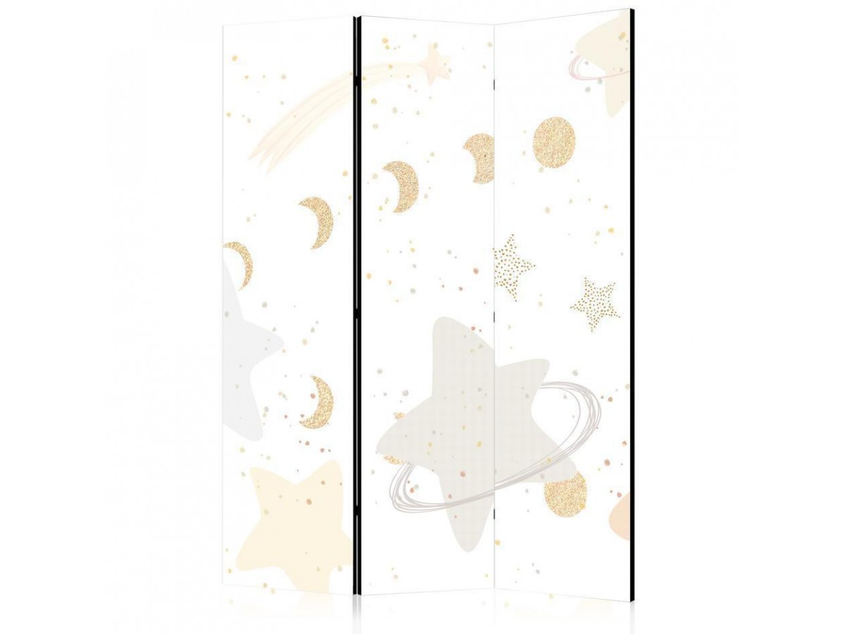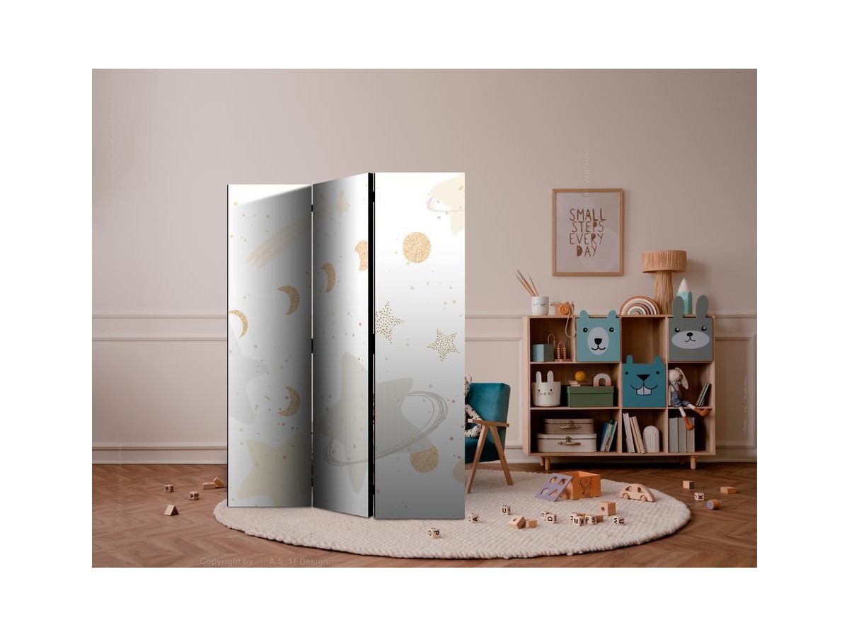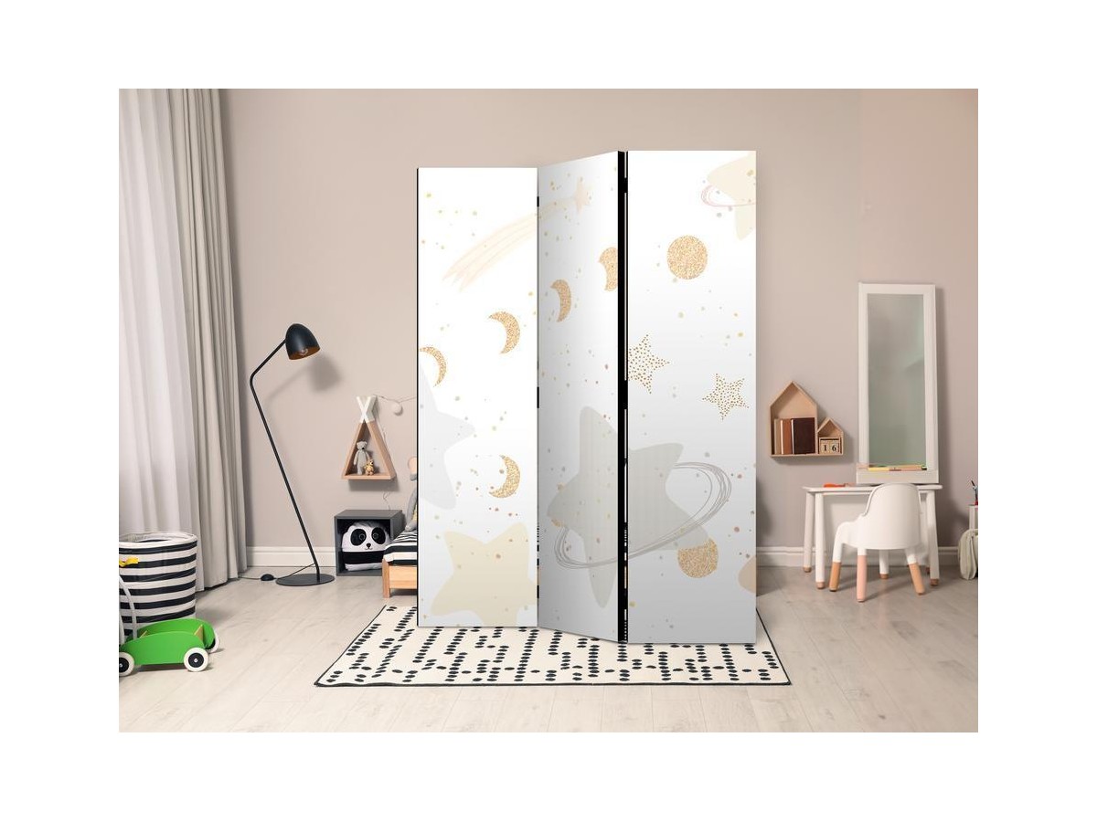 Les paravents décoratifs sont certainement une idée originale dans le domaine de la décoration intérieure. Les paravents remplissent un rôle décoratif, mais aussi bien pratique et fonctionnel. En effet, un paravent intérieur "Paravent - Fairy-Tale Galaxy - Moon Phases in Shades of Yellow Among Stars in Beige and Ash Colors with Stardust" est un meuble formant une cloison amovible et repliable qui peut servir pour délimiter un espace et diviser une grande pièce en deux espaces séparés. Le paravent intérieur est une invention qui est apparue pour la première fois en Chine. Depuis le début de leur existence, les paravents remplissaient des différentes fonctions, comme protéger contre les courants d'air ou bien encore créer un espace isolé pour l'intimité. De nos jours, le paravent intérieur est une belle décoration intérieure, qui permet aussi de gérer l'espace d’une ou de plusieurs pièces selon notre volonté. Le paravent intérieur est également utilisé dans les locaux de service, comme un coiffeur, un cabinet médical ou un bureau comptable pour créer un espace propice à l’intimité ou bien encore à la concentration.