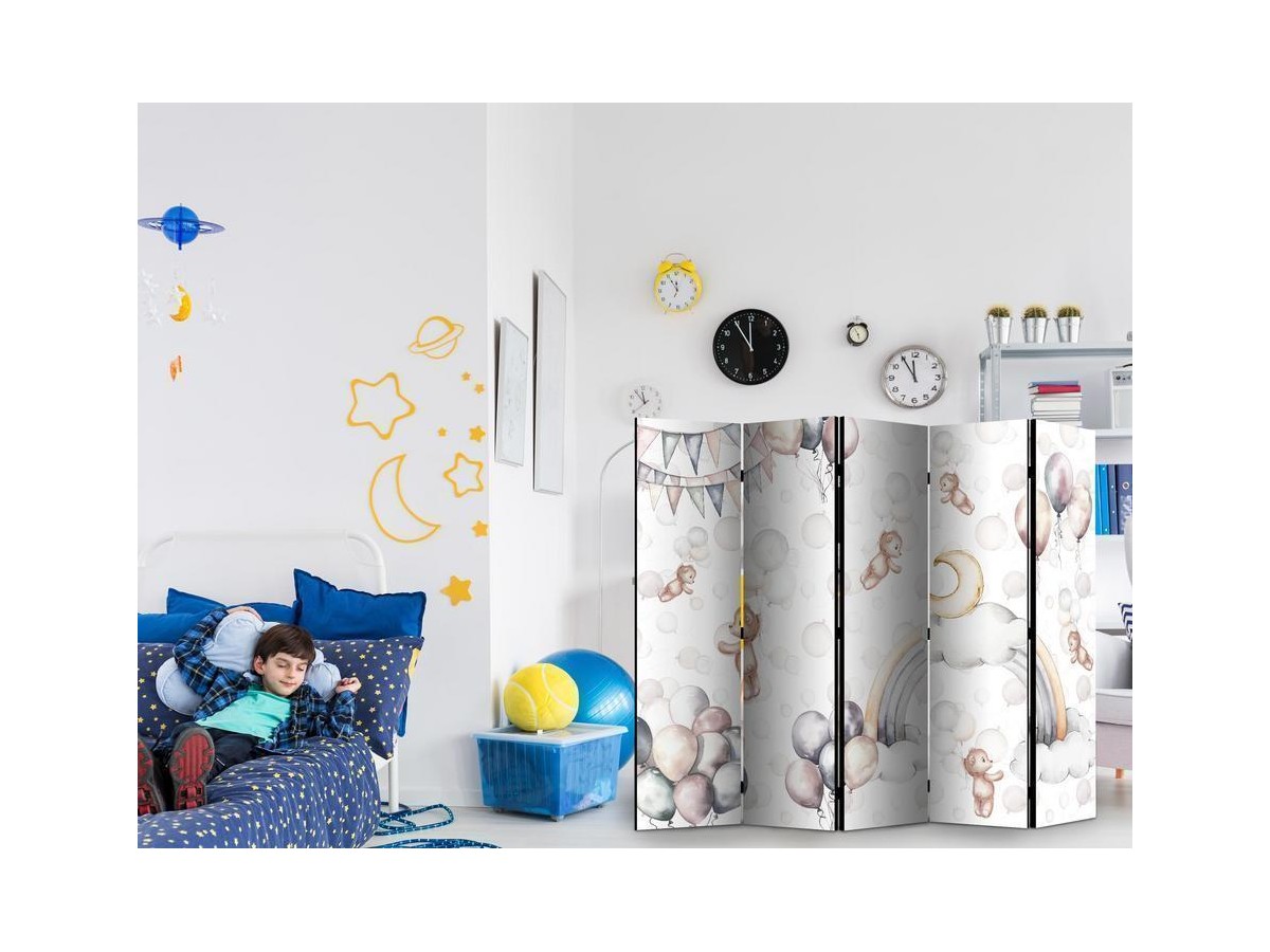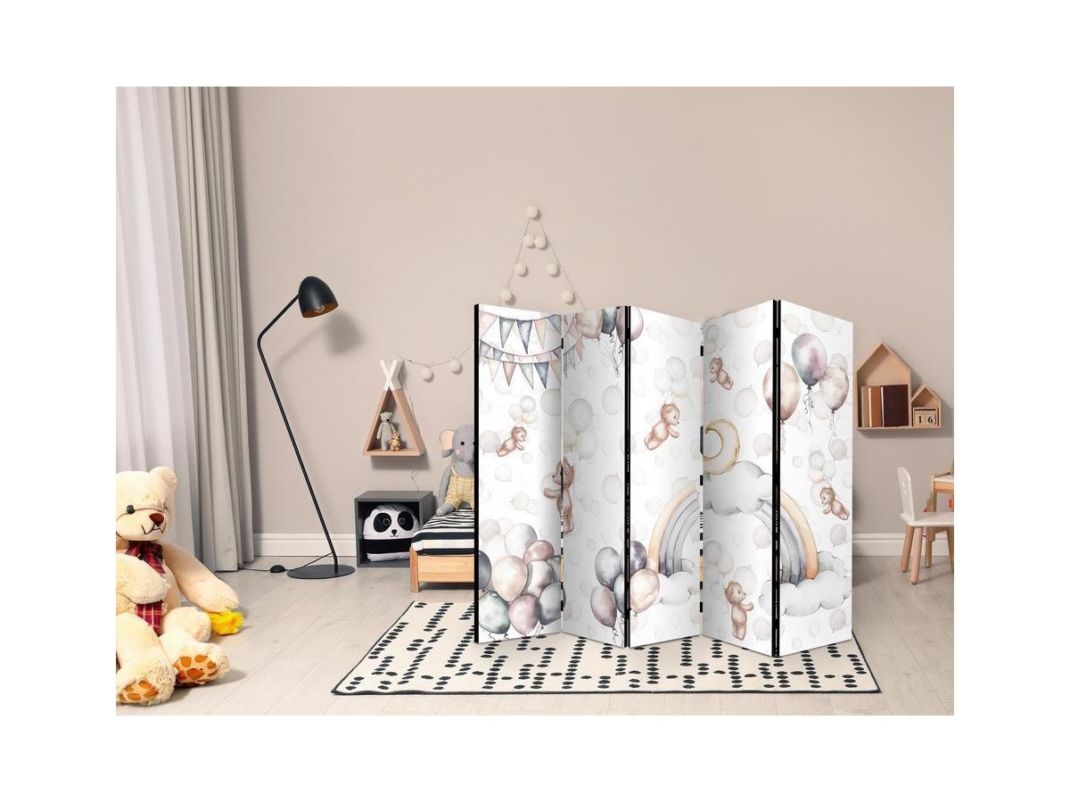 Les paravents décoratifs sont certainement une idée originale dans le domaine de la décoration intérieure. Les paravents remplissent un rôle décoratif, mais aussi bien pratique et fonctionnel. En effet, un paravent intérieur "Paravent - Plush Bears with Balloons - Flying Light-Brown Bears Among Balloons - Clouds - and Rainbows in Subdued - Pastel Hues" est un meuble formant une cloison amovible et repliable qui peut servir pour délimiter un espace et diviser une grande pièce en deux espaces séparés. Le paravent intérieur est une invention qui est apparue pour la première fois en Chine. Depuis le début de leur existence, les paravents remplissaient des différentes fonctions, comme protéger contre les courants d'air ou bien encore créer un espace isolé pour l'intimité. De nos jours, le paravent intérieur est une belle décoration intérieure, qui permet aussi de gérer l'espace d’une ou de plusieurs pièces selon notre volonté. Le paravent intérieur est également utilisé dans les locaux de service, comme un coiffeur, un cabinet médical ou un bureau comptable pour créer un espace propice à l’intimité ou bien encore à la concentration.