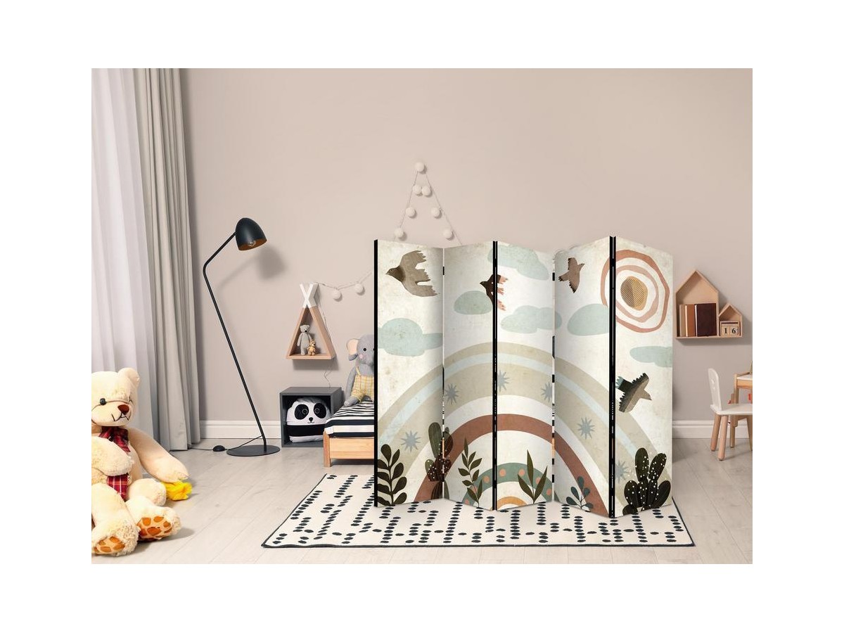 Paravent - Sun Above the Rainbow - Birds in Subdued Colors Flying Among Clouds Above a Rainbow and Vegetation on a Light