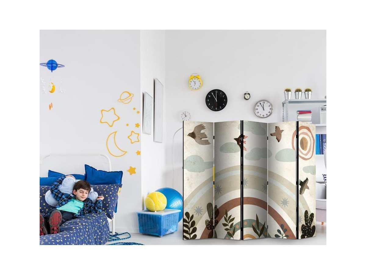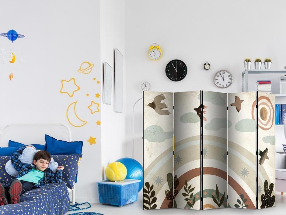 Les paravents décoratifs sont certainement une idée originale dans le domaine de la décoration intérieure. Les paravents remplissent un rôle décoratif, mais aussi bien pratique et fonctionnel. En effet, un paravent intérieur "Paravent - Sun Above the Rainbow - Birds in Subdued Colors Flying Among Clouds Above a Rainbow and Vegetation on a Light Beige Background" est un meuble formant une cloison amovible et repliable qui peut servir pour délimiter un espace et diviser une grande pièce en deux espaces séparés. Le paravent intérieur est une invention qui est apparue pour la première fois en Chine. Depuis le début de leur existence, les paravents remplissaient des différentes fonctions, comme protéger contre les courants d'air ou bien encore créer un espace isolé pour l'intimité. De nos jours, le paravent intérieur est une belle décoration intérieure, qui permet aussi de gérer l'espace d’une ou de plusieurs pièces selon notre volonté. Le paravent intérieur est également utilisé dans les locaux de service, comme un coiffeur, un cabinet médical ou un bureau comptable pour créer un espace propice à l’intimité ou bien encore à la concentration.