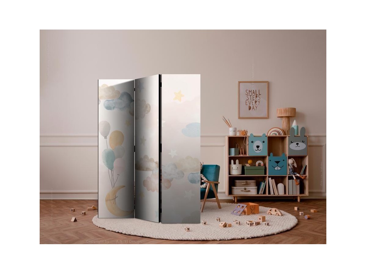 Les paravents décoratifs sont certainement une idée originale dans le domaine de la décoration intérieure. Les paravents remplissent un rôle décoratif, mais aussi bien pratique et fonctionnel. En effet, un paravent intérieur "Paravent - Fairy-Tale Moon - Moon with Balloons Among Clouds and Stars in Subdued Colors on a Light Beige Background" est un meuble formant une cloison amovible et repliable qui peut servir pour délimiter un espace et diviser une grande pièce en deux espaces séparés. Le paravent intérieur est une invention qui est apparue pour la première fois en Chine. Depuis le début de leur existence, les paravents remplissaient des différentes fonctions, comme protéger contre les courants d'air ou bien encore créer un espace isolé pour l'intimité. De nos jours, le paravent intérieur est une belle décoration intérieure, qui permet aussi de gérer l'espace d’une ou de plusieurs pièces selon notre volonté. Le paravent intérieur est également utilisé dans les locaux de service, comme un coiffeur, un cabinet médical ou un bureau comptable pour créer un espace propice à l’intimité ou bien encore à la concentration.