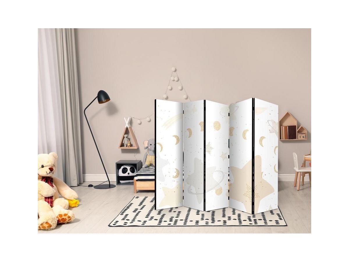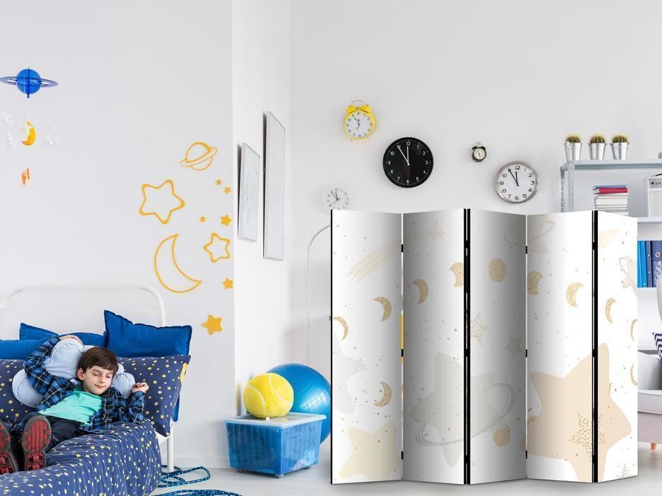 Les paravents décoratifs sont certainement une idée originale dans le domaine de la décoration intérieure. Les paravents remplissent un rôle décoratif, mais aussi bien pratique et fonctionnel. En effet, un paravent intérieur "Paravent - Fairy-Tale Galaxy - Moon Phases in Shades of Yellow Among Stars in Beige and Ash Colors with Stardust" est un meuble formant une cloison amovible et repliable qui peut servir pour délimiter un espace et diviser une grande pièce en deux espaces séparés. Le paravent intérieur est une invention qui est apparue pour la première fois en Chine. Depuis le début de leur existence, les paravents remplissaient des différentes fonctions, comme protéger contre les courants d'air ou bien encore créer un espace isolé pour l'intimité. De nos jours, le paravent intérieur est une belle décoration intérieure, qui permet aussi de gérer l'espace d’une ou de plusieurs pièces selon notre volonté. Le paravent intérieur est également utilisé dans les locaux de service, comme un coiffeur, un cabinet médical ou un bureau comptable pour créer un espace propice à l’intimité ou bien encore à la concentration.