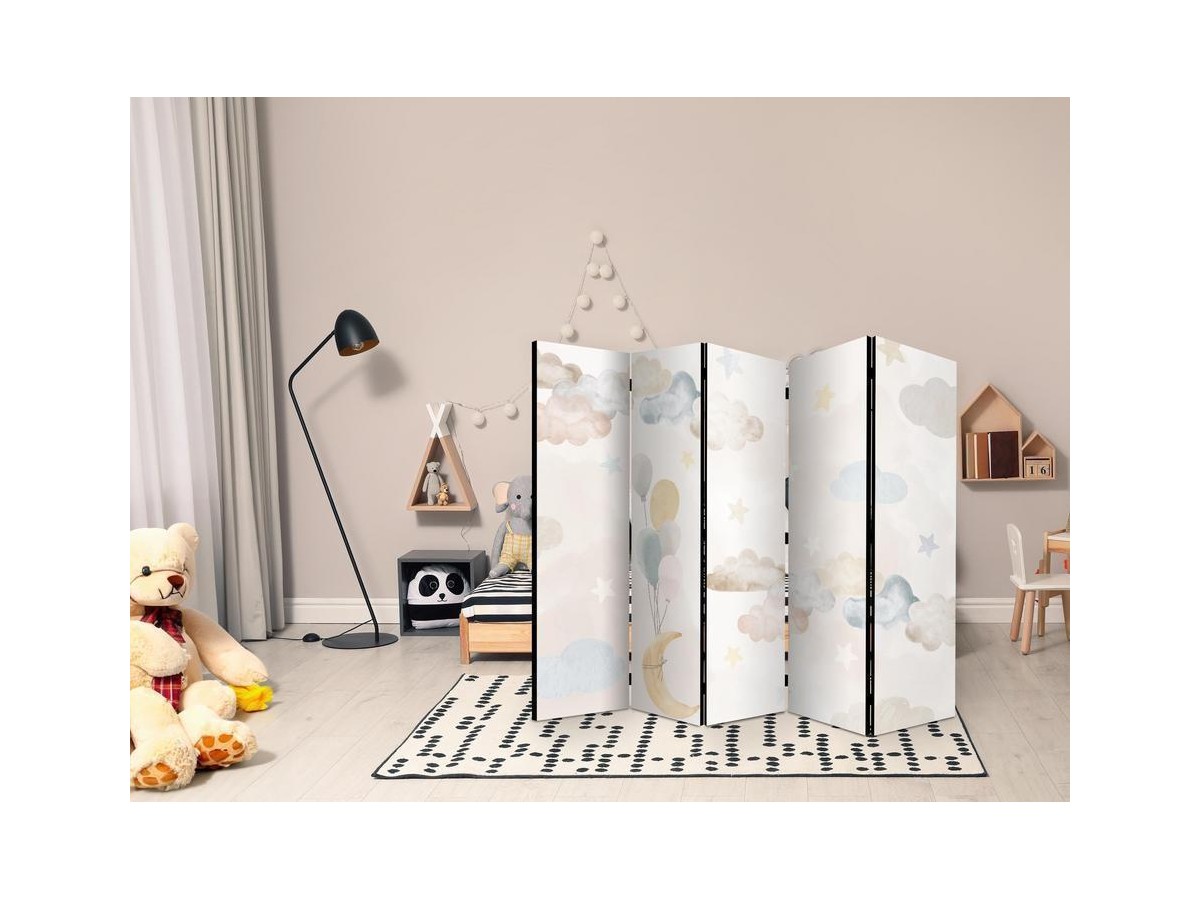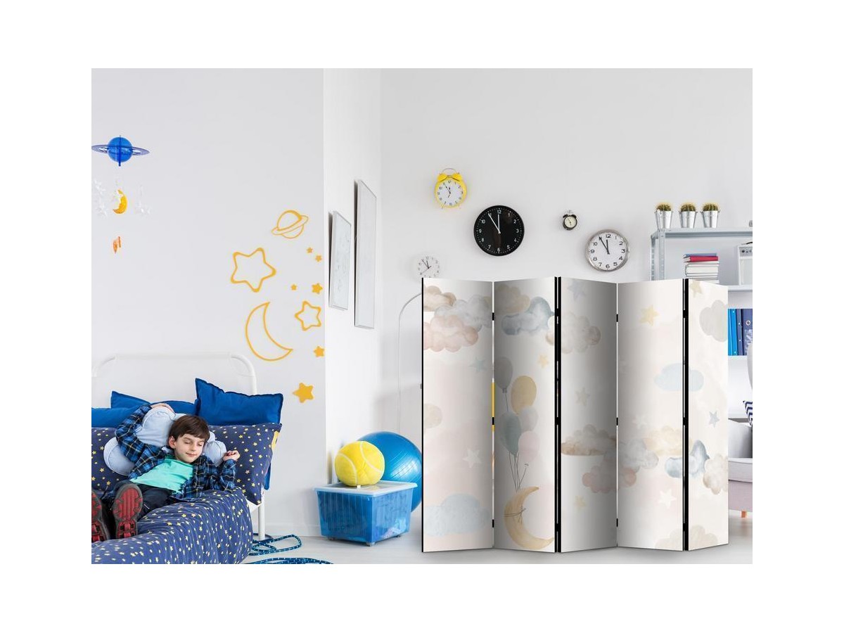 Les paravents décoratifs sont certainement une idée originale dans le domaine de la décoration intérieure. Les paravents remplissent un rôle décoratif, mais aussi bien pratique et fonctionnel. En effet, un paravent intérieur "Paravent - Fairy-Tale Moon - Moon with Balloons Among Clouds and Stars in Subdued Colors on a Light Beige Background" est un meuble formant une cloison amovible et repliable qui peut servir pour délimiter un espace et diviser une grande pièce en deux espaces séparés. Le paravent intérieur est une invention qui est apparue pour la première fois en Chine. Depuis le début de leur existence, les paravents remplissaient des différentes fonctions, comme protéger contre les courants d'air ou bien encore créer un espace isolé pour l'intimité. De nos jours, le paravent intérieur est une belle décoration intérieure, qui permet aussi de gérer l'espace d’une ou de plusieurs pièces selon notre volonté. Le paravent intérieur est également utilisé dans les locaux de service, comme un coiffeur, un cabinet médical ou un bureau comptable pour créer un espace propice à l’intimité ou bien encore à la concentration.