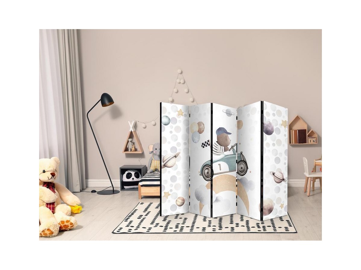 Paravent - Galactic Races - Bear Participating in Car Races Among Planets - Clouds - and Stars in Pastel Hues