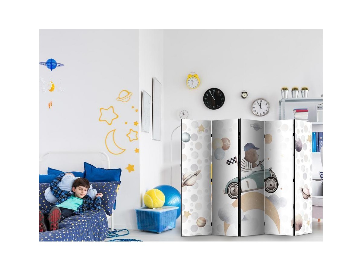 Paravent intérieur "Paravent - Galactic Races - Bear Participating in Car Races Among Planets - Clouds - and Stars in Pastel Hues"