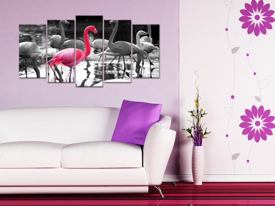 Magnifique tableau sur toile imprimée, ce cadre mural animaux photographie de flamants roses en noir et blanc, dont un en couleur, confère à cet animal une beauté extraordinaire et une couleur forte en intensité. Réalisé en un tableau en 5 parties, aussi appelé quintyque, cette toile décorative flamants roses apportera de l'originalité et du charme à votre intérieur pour une décoration contemporaine réussie !
