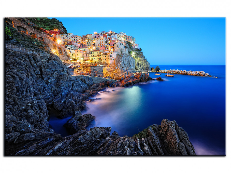 Apportez une touche d'évasion à votre intérieur avec ce tableau photo sur toile représentant le pittoresque village de Riomaggiore en Italie. Impression de haute qualité sur toile tendue, idéale pour une décoration murale élégante et inspirante